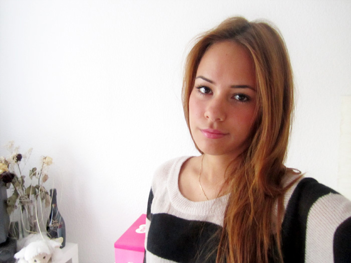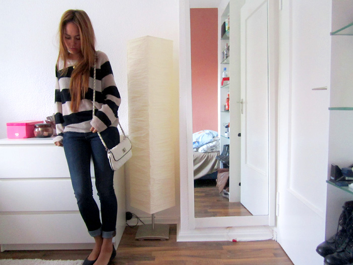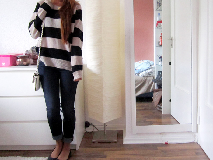 Wie versprochen: Oufitfotos mit dem Stativ und nicht so „altmodisch“ vor dem Spiegel ;) Diesen Pulli gibt es zur Zeit für rund 10€ bei H&M und ich habe ihn mit Absicht in Large gekauft. Mir gefällt das mit den überlangen Ärmeln. Auf den Lippen trage ich Barbie-rosa. Dafür habe ich einfach zwei Lippenstifte gemischt: Zuerst habe ich einen Hautfarbenen von P2 aufgetragen (010 Rodeo Drive), dann 370 Crazy Fuchsia von L’Oréal Color Riche und abschließend nochmal etwas von dem nudefarbenen raufgetupft.