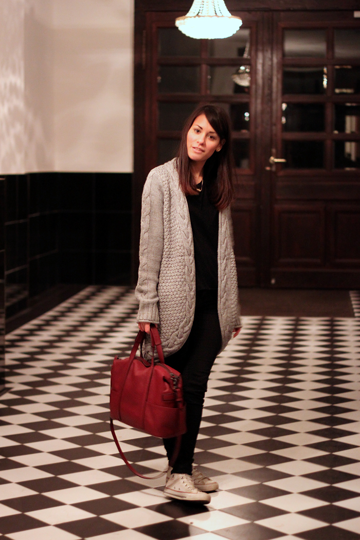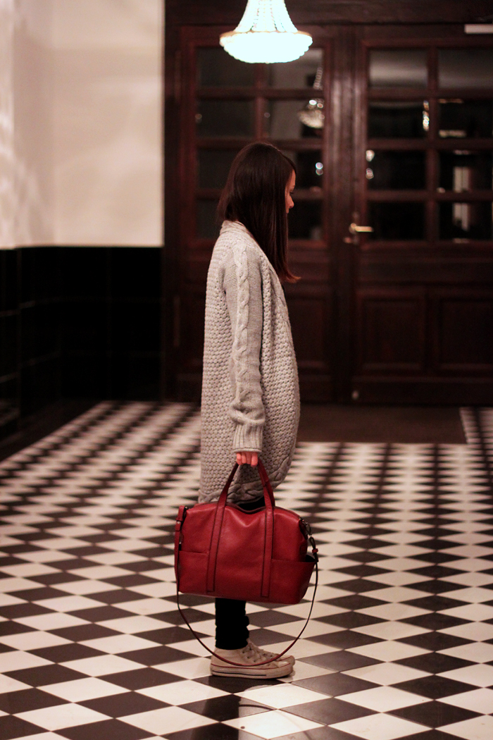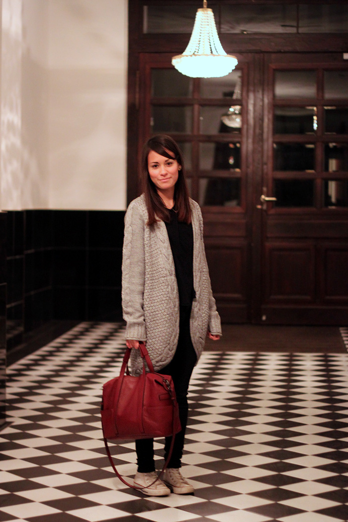Jedenfalls waren mein Freund und ich vor zwei Wochen bei Freunden zum Essen eingeladen. Gute deutsche Küche bestehend aus Braten, selbstgemachten Semmelknödeln und Rotkohl gab’s :) Yumm yumm, wie ein vorweihnachtliches Festmahl. Auf dem Hinweg durfte mein Freund dann mal wieder Outfitfotos von mir machen und bei der Gelegenheit haben wir eine schöne Eingangshalle entdeckt. Schön, nur das mit dem Fokus müssen wir noch üben ;) Achja, die Tasche ist nicht neu, nur noch nicht gezeigt und wunderschön <3