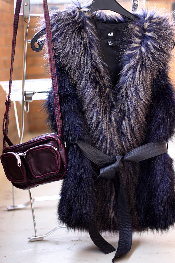 (1) Wollschal mit Fransen, Zara (2) Top-Handle Leatherbag, Zara (3) „Brenda“ Alexander Wang Replika, H&M (4) Fellweste, H&M