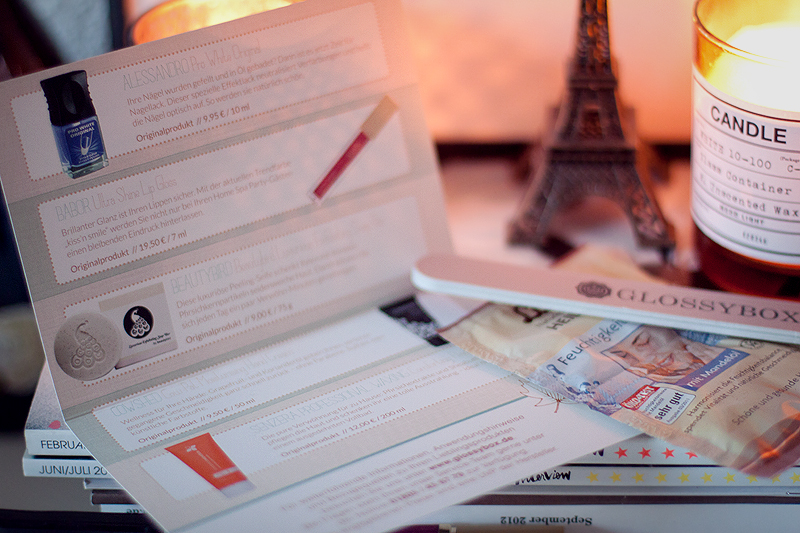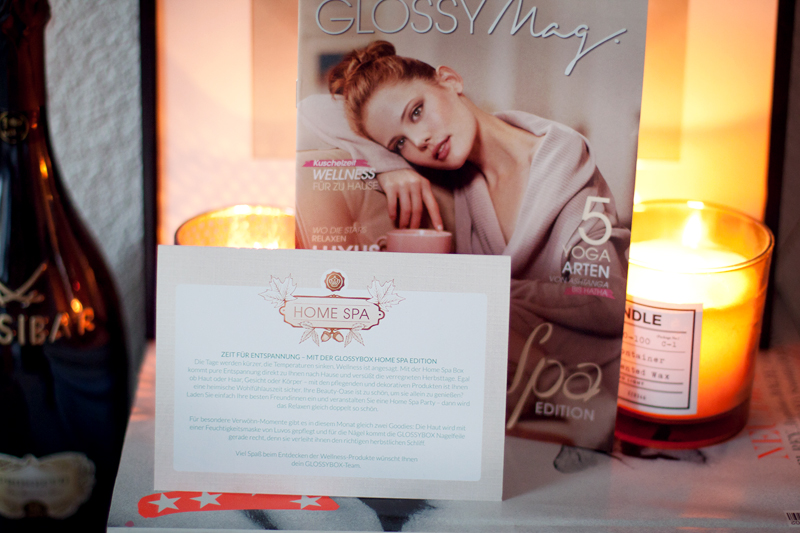 Ein neuer Monat, eine neue Glossybox! Dieses Mal handelt es sich um eine "Home Spa" Edition. Entspannung für Haut , Haar, Gesicht un Körper steht hier also im Vordergrund – und ich habe dazu passend meine Kerzen mit ins Bild gesetzt ;) Die Box sieht allerdings aus wie regulär, lediglich das Kärtchen ist diesmal anders und beinhaltet nun auch Abbildungen zu den enthaltenen Produkten – I like!