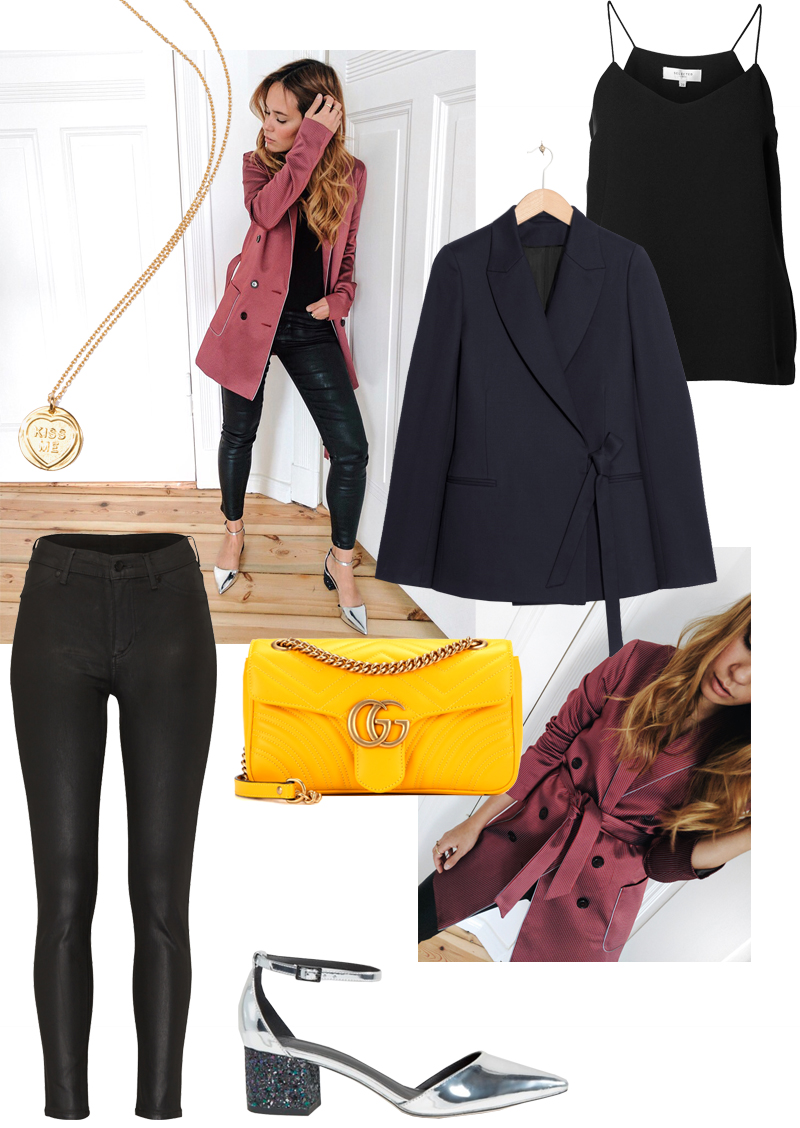 Wir stecken mitten im Weihnachtsfeier-Marathon und auch Heiligabend steht schon fast vor der Tür. Was ziehe ich also an, vorallem, wenn man nicht der Typ für Kleider ist? Ich wähle gerne ein Outfit, was sich für die Festlichkeiten eignet, aber auch für das ganze Jahr passend wäre: Eine beschichtete Jeans, die mit dem leichten Glanz gleich etwas festlicher aussieht, einen beerenfarbenen Blazer im Pyjama-Look – quasi der klassische Blazer neu interpretiert – darunter ein schwarzes Camisole und, mein persönliches Highlight, silberne Pumps! Und da mein Look auf Instagram so gut ankam, gibt es ihn nun in unseren Sunday’s Cravings mit den passenden Produkten.