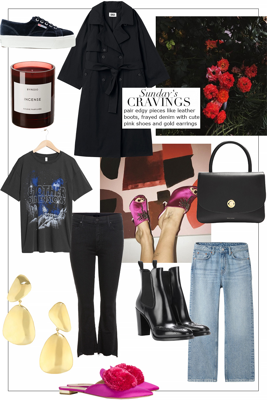Das Thema des heutigen Sunday’s Cravings ist das „Und“ in unseren Looks und das Spielen mit Kontrasten. Ich möchte schick undlässig aussehen, edgy und glamourös, schwarz und Farbe… Ich könnte endlos so weiter machen. Ich mein ist die Kombination auß einem flatternden Blümchenkleid und derben Boots nicht unschlagbar? Oder eben Print-Shirt und Ripped-Jeans, gepaart mit knallpinken Satin-Mules und Statement-Earrings.