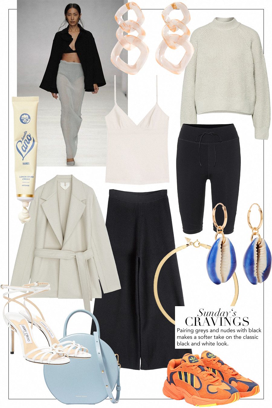Wenn man statt Weiß lieber Grautöne und zarte Nudetöne oder Cremeweiss zu Schwarz kombiniert, dann ergibt das einen weicheren Schwarz-Weiß-Look. Der Kontrast ist da, ist aber ist so natürlich nicht so hart. Dafür setze ich weiter auf die anderen Kontraste, wie Silhouetten: Eine enge Radlerhose (ja, sie sind noch da) zu einem weiten Strickpullover oder weite Hosen mit schlag zu engen Camisoles.