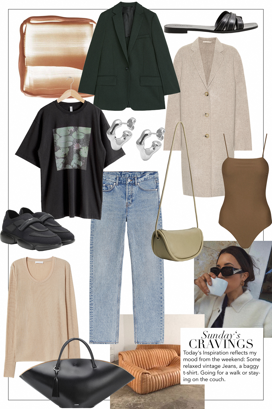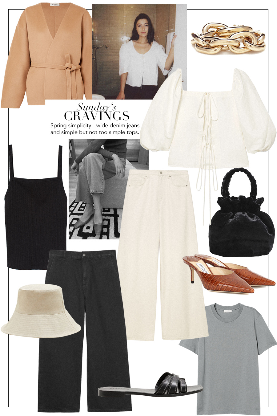 Meine Standard-Outfit im Frühlings-/Sommer wird höchstwahrscheinlich wie folgt aussehen: weite bodenlange oder gecroppte Jeans, dazu ein T-Shirt, Tanktop oder eine schöne Bluse und flache schlappen oder Mules. Zum Überziehen dient eine Jacke aus Kaschmir-Woll-Mischung und mit dabei – na klar – immer der Fischerhut aka Bucket Hat. Insgesamt – ihr kennt es schon – simpel aber nicht so simple, dass der Look aus reinen Basics besteht, sondern mit Formen, Schnitten und Details spielt.