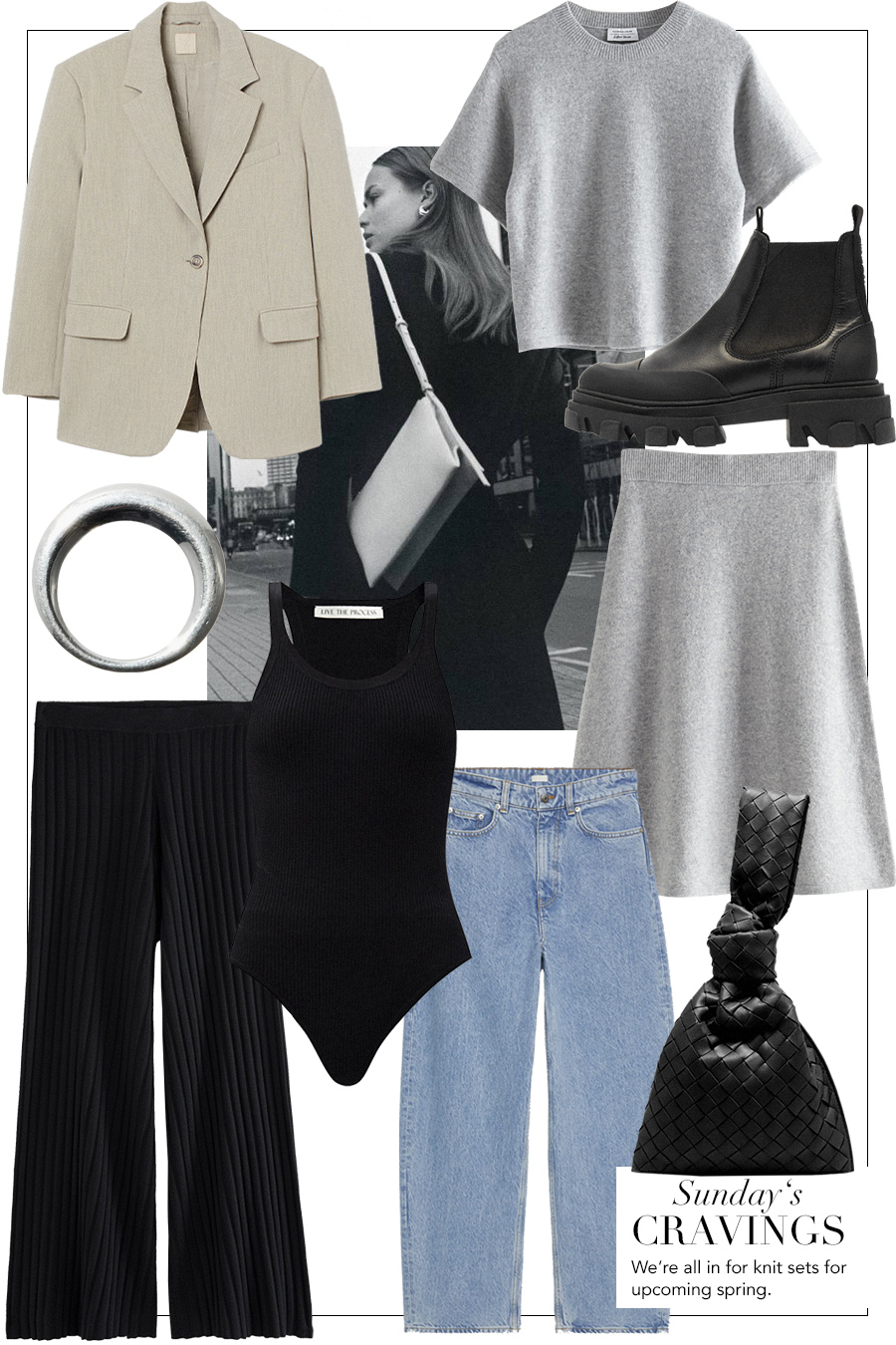 Cropped distresses shirt H&M. Jacquard baguette bag Mango. Crepped midi skirt H&M. Seamless rib body Filippa K. ,Mair 90′ patent-leather pumps Jimmy Choo. Kick flare stretch trousers Arket. Rattan lounge chair H&M Home. Square raffia tote bag Loewe. ,Gel-1090′ mesh trainers Asics