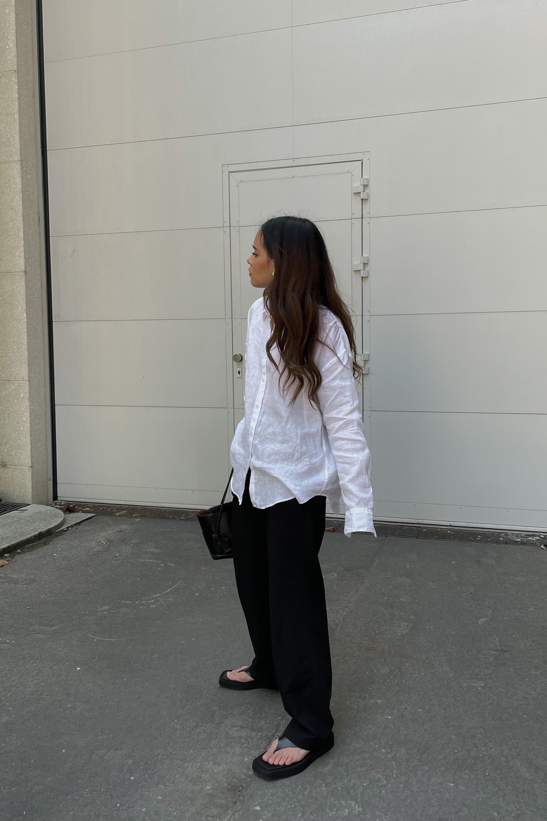 Eine schwarze Anzugshose und ein weißes Hemd. Das klingt ganz nach einer klassischen Kombination, auf die ich in jeder Jahreszeit gerne zurückgreife. Aus Leinen und mit einem lockeren Fit wird das Outfit zu einem bequemen Go-To-Outfit für den Sommer. Super bequem aber trotzdem schick! Sowohl die Hose als auch das Hemd von Uniqlo sind jeweils schon locker geschnitten. Lediglich beim Hemd habe ich eine Größe größer genommen, um den Oversized-Look noch zu verstärken.