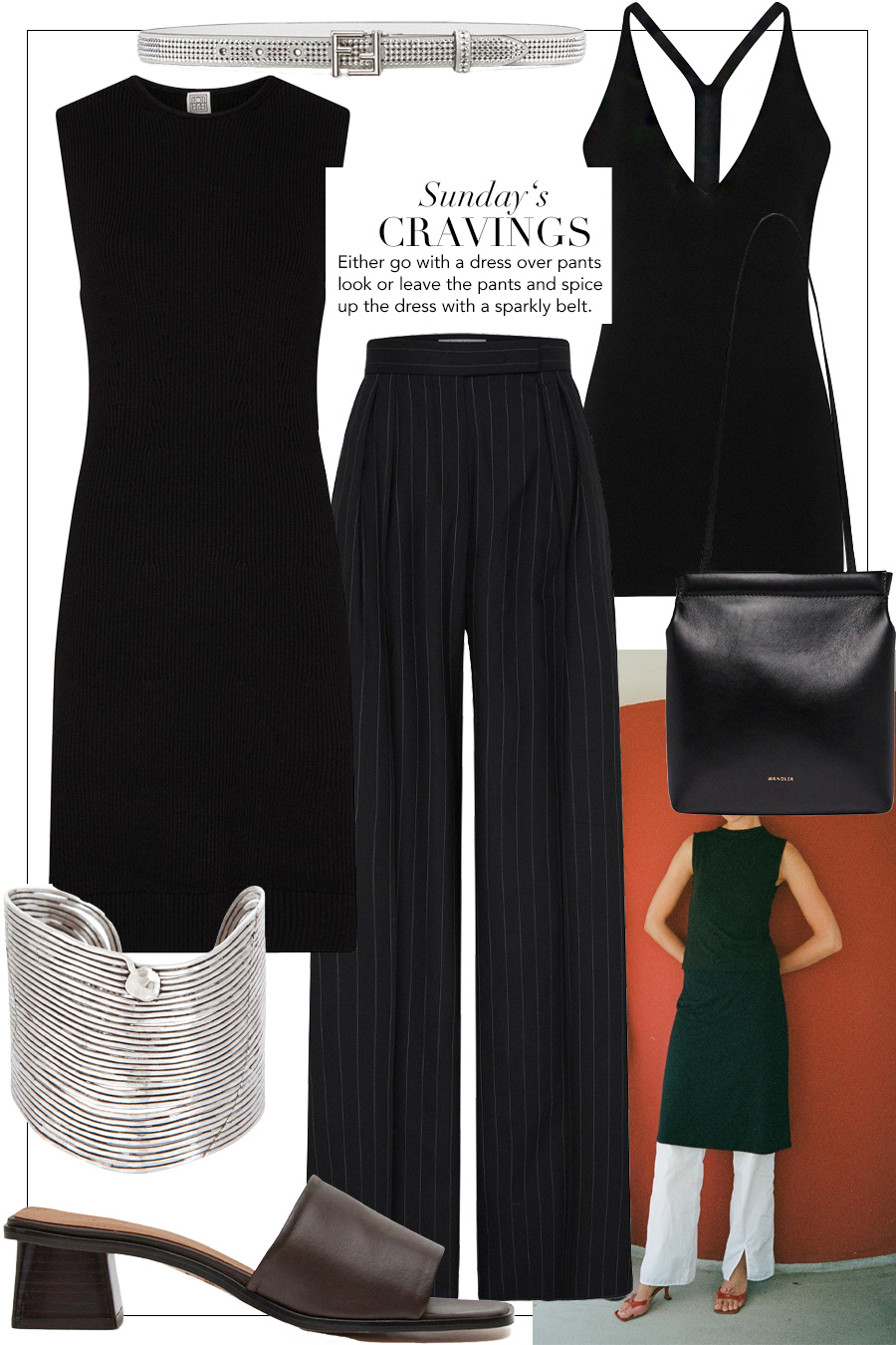 ,Fatal Cut Out‘ tube dress Wolford. Double breasted wool blazer COS. Rib tank top Arket. Cropped tube top Uniqlo. Waterfall neck satin top Philosophy Di Lorenzo Serafini. Wide fit pleated pants Uniqlo. Brown leather shopper Hereu. Satin ballerina flats Reformation.