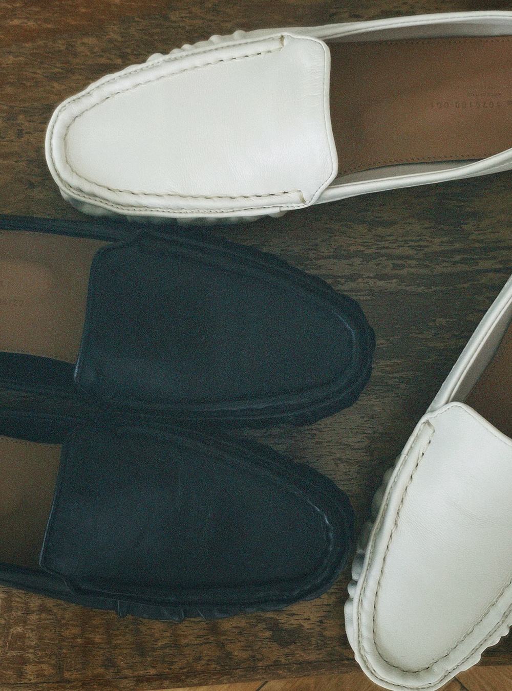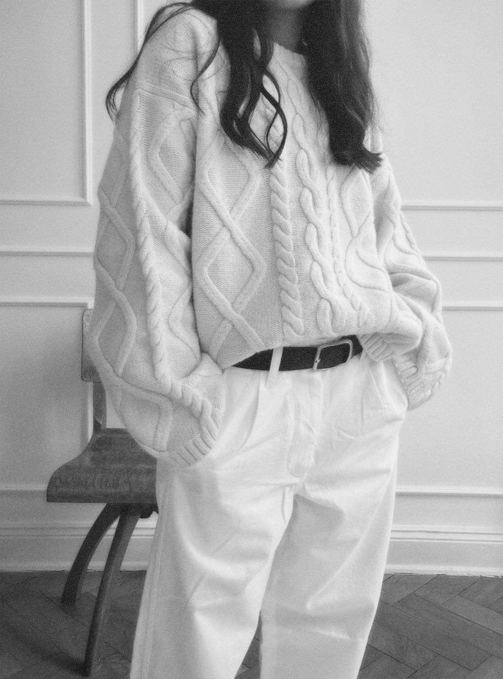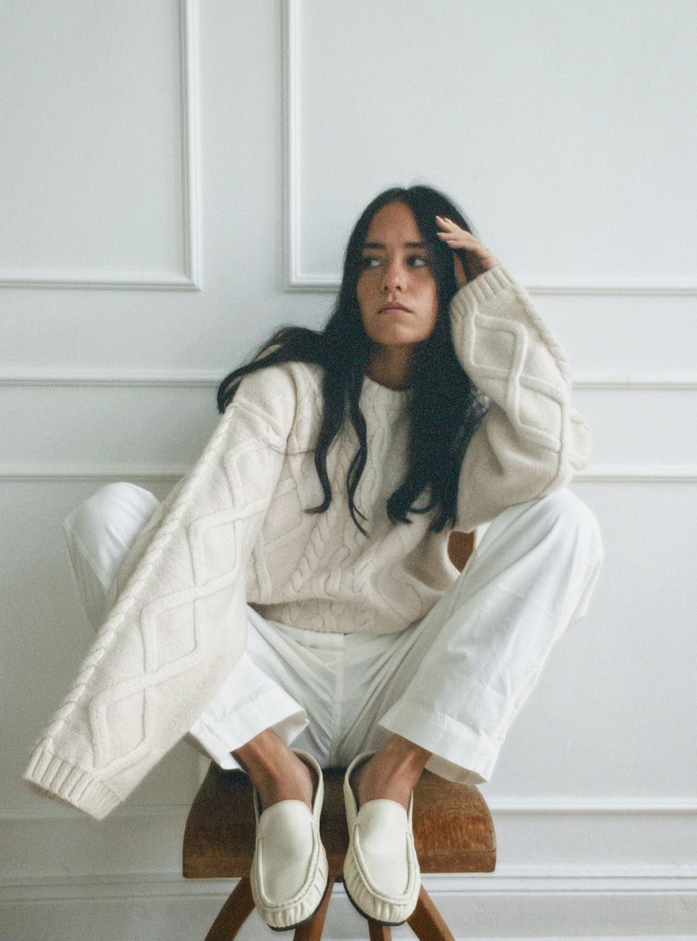 in this photoCable knit wool jumper – Arket. Barrel leg cotton chinos – Arket. White leather laofers – Arket.