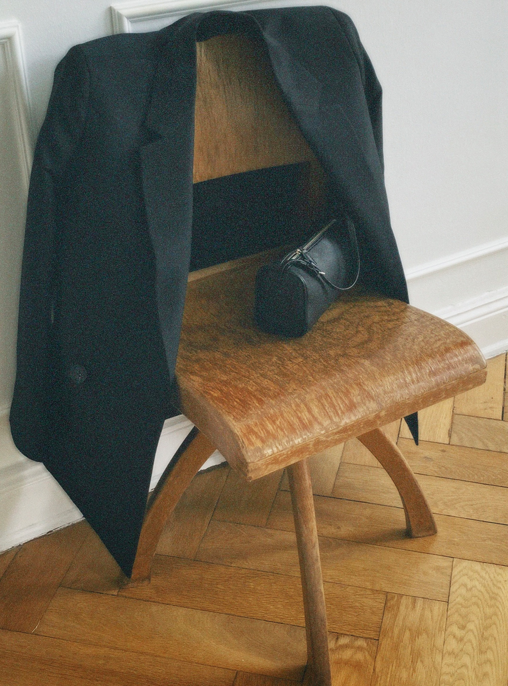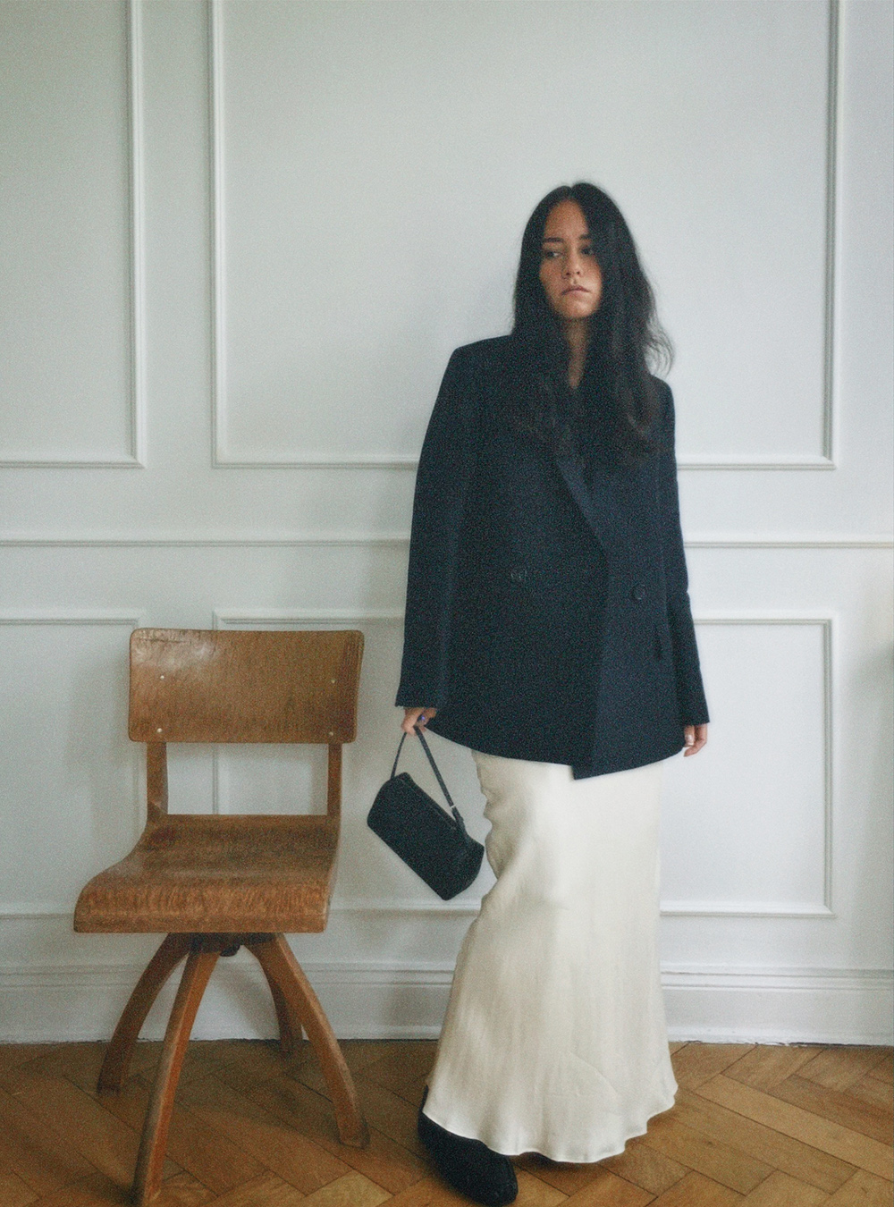 in this photoDouble breasted satin blazer – Arket. Dress – Dissh. Bag – The Row.