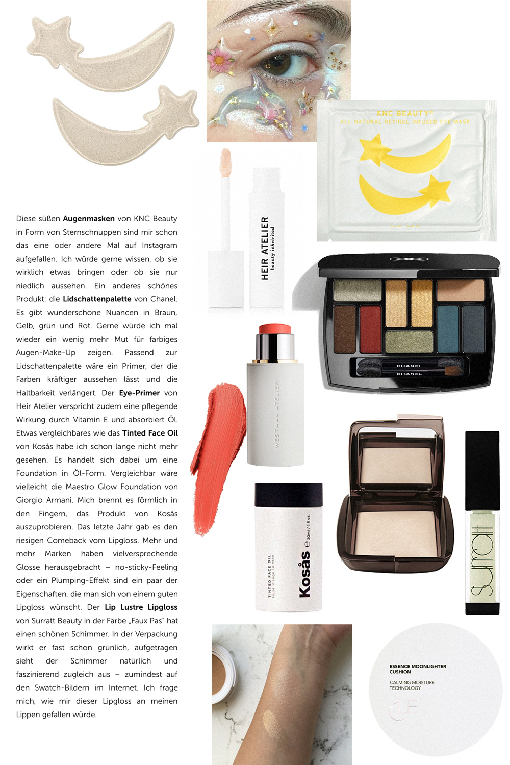 Auf meiner Wunschliste steht noch das Ambient Lighting Powder von Hourglass. Desi besitzt dieses sanft illuminierende Gesichtspuder, weshalb ich es schon ein paar Male ausprobieren konnte. Es „settet“ das Make-Up und zaubert dabei einen schönen und zugleich sehr subtilen Glow auf der Haut – ein Traum! Zu guter Letzt haben wir da noch einen Highlighter – und zwar im Cushion-Format. Gab es das schon mal? Mir ist das jedenfalls neu. Der Essence Moonlighter Cushion von Cle sieht geswatched super schön aus – auffällig aber dennoch auf eine Art natürlich. Außerdem versprechen die Moonlighter eine feuchtigkeitsspendende Wirkung durch Squalan – wanna try, please!