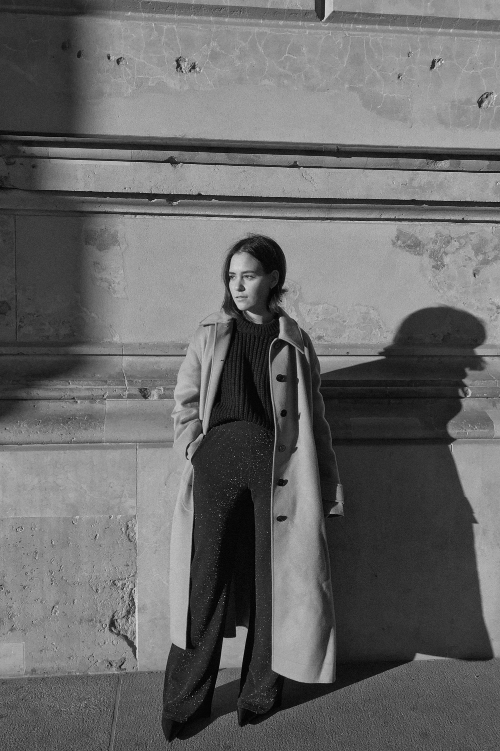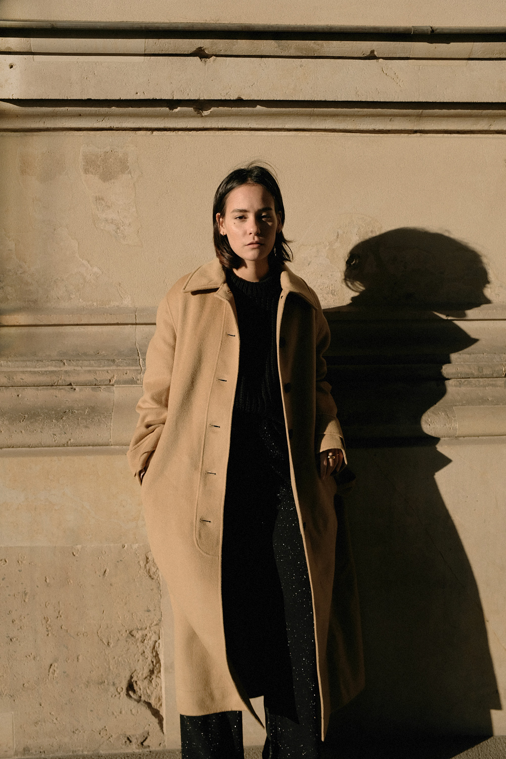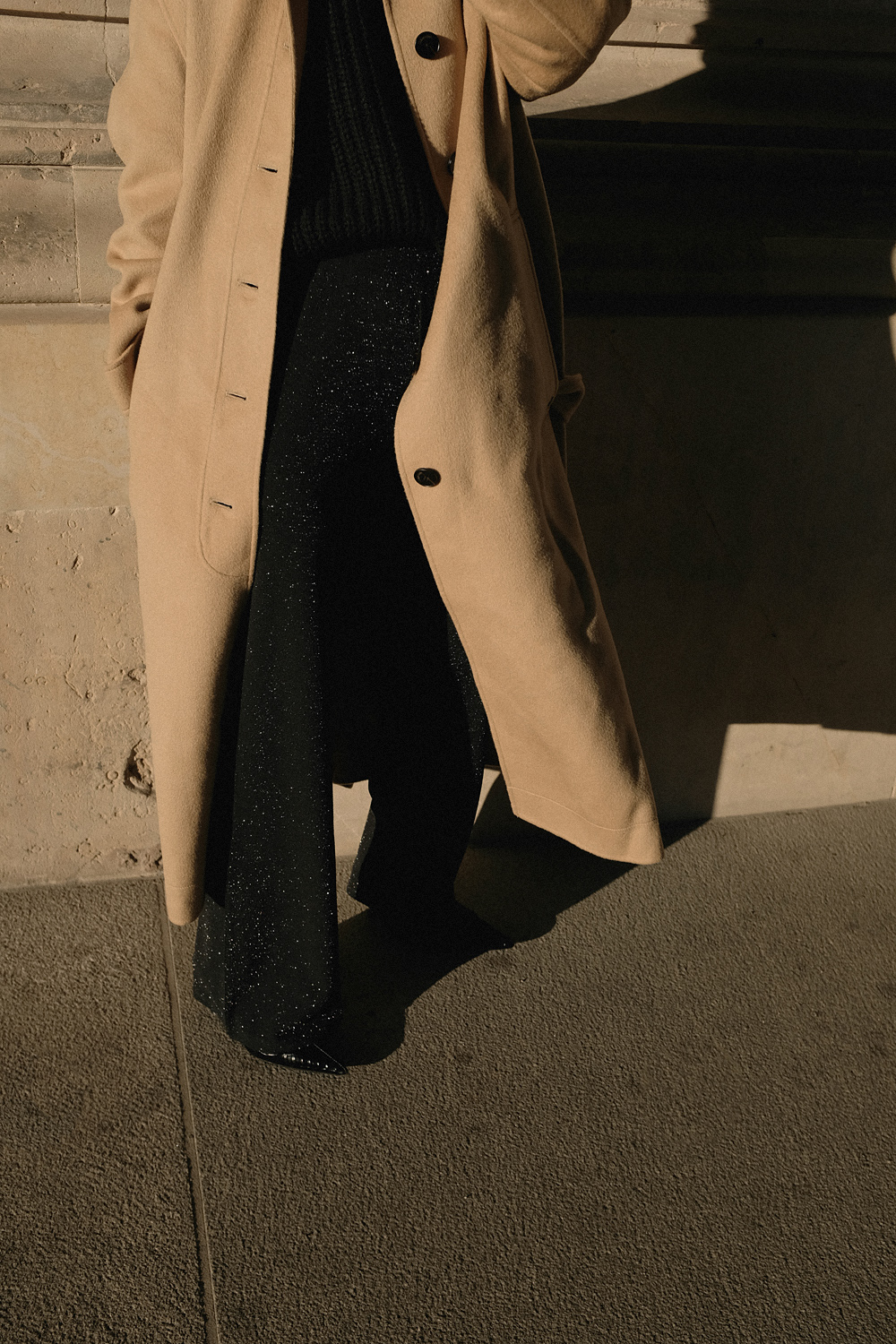 Camel Coat Calvin Klein (similar). Glitter pants Karen by Simonsen (similar). Chunky black knit Topshop(similar). Boots Zign (similar). „L’Or Liquide“ ring by teetharejade. Thick ring Daphine (similar).
