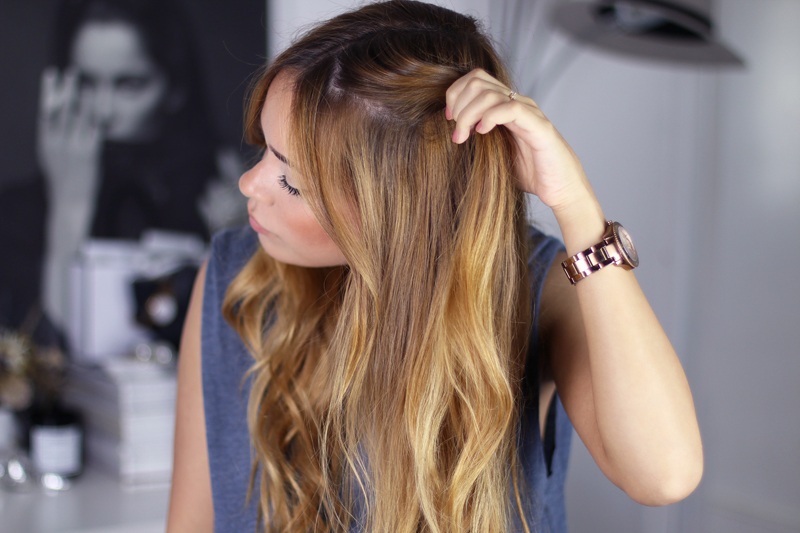 (1) Meine Ausgangsfrisur besteht aus leichten Wellen, die ich mit den Lockenstab gemacht habe. Ob frisch gemacht oder vom Vortag ist hier relativ egal, es soll bloß nicht zu puppenhaft und perfekt aussehen. Wer solche Wellen/große Locken von Natur aus hat: Ihr seid so gesegnet und ich bin so neidisch! ;)