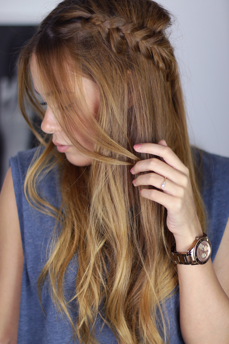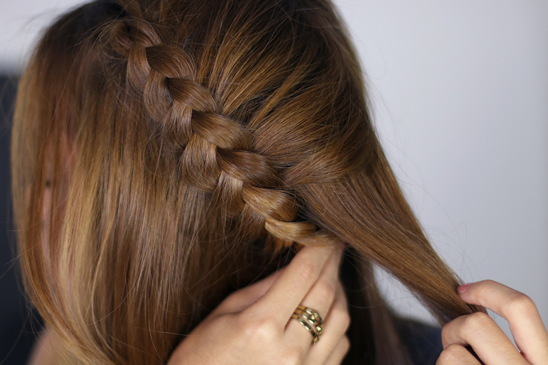 (5) Jedes Mal, wenn ich die Strähne, die auf der Scheitelseite liegt, rüber lege, arbeite ich ein paar Strähnchen vom Deckhaar mit ein. Von der Technik her quasi wie ein halber französischer Zopf. So flechte ich bis zum Hinterkopf und danach ein paar Zentimeter weiter, ohne weitere Strähnen dazu zu nehmen. Den Zopf befestige ich mit einem transparenten Gummiband.