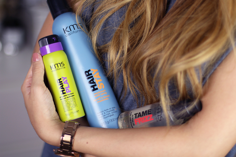 (2) Damit die Haare mehr Griffigkeit bekommen und somit leichter zu Flechten und zu Formen sind, sprühe ich mir das Textur-Spray Hair Play von KMS California in die Haare – ohne dabei Angst haben zu müssen, dass sie verkleben.
