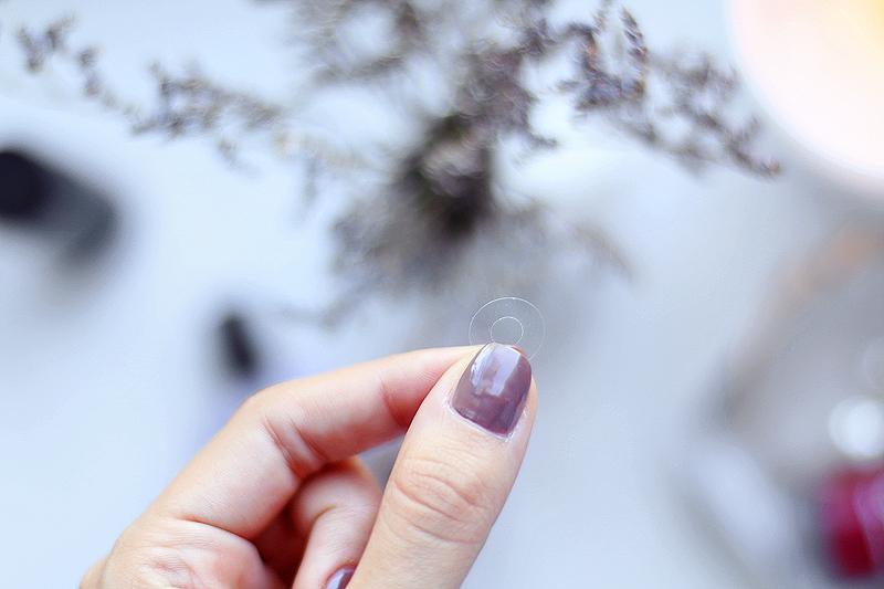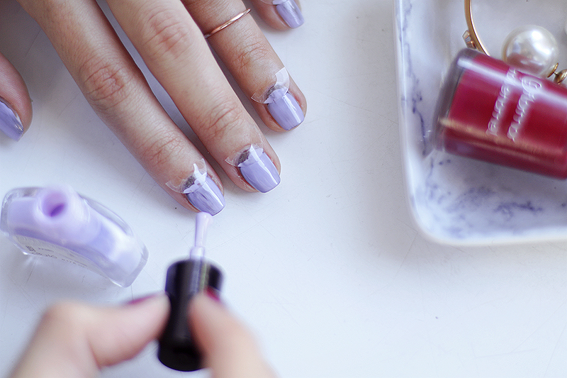 (1) Zuerst wird die Grundierung lackiert. Es sollte darauf geachtet werden, dass am Nagelbett besonders sauber lackiert wird. (2) Nun kommt der Trick der ganzen Sache zum Einsatz: Um eine perfekt runde Form zu erhalten, helfen diese Verstärkungsringe, die in jedem Schreibwarenladen zu finden sind. (3) Falls sie zu stark kleben, einfach mit den Fingern etwas über die Klebeseite gehen. Dann in der Mitte durchschneiden (so verbraucht man weniger) und auf dem Nagel platzieren. (4) Dann lackiert man mit der zweiten Farbe drüber. Je nach Deckkraft braucht man ein oder zwei Schichten. (5) Gut trocknen lassen (das entscheidet über gelingen oder misslingen!) und die Ringe vorsichtig abziehen. (6) Nur noch einen Überlack drüber und fertig!
