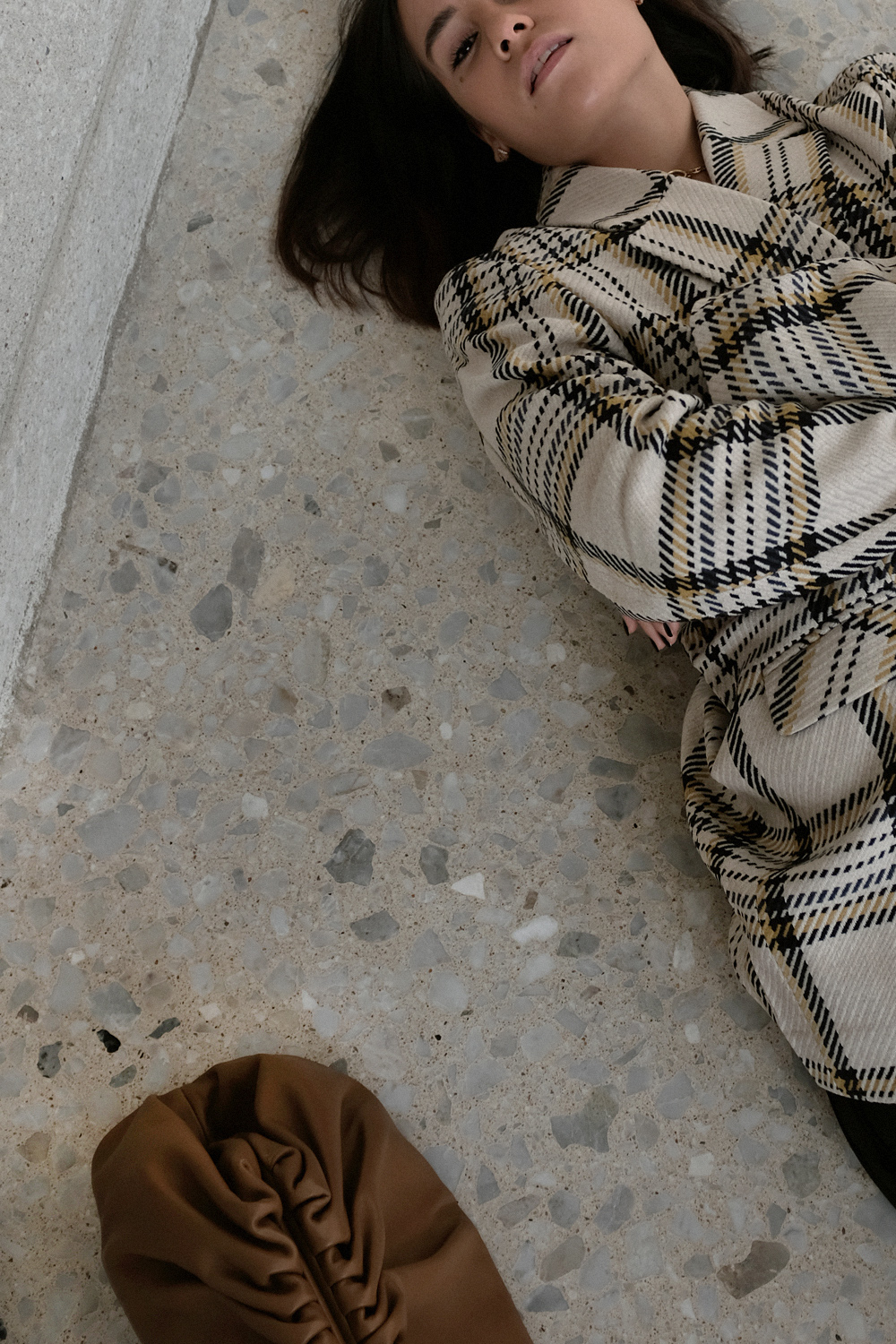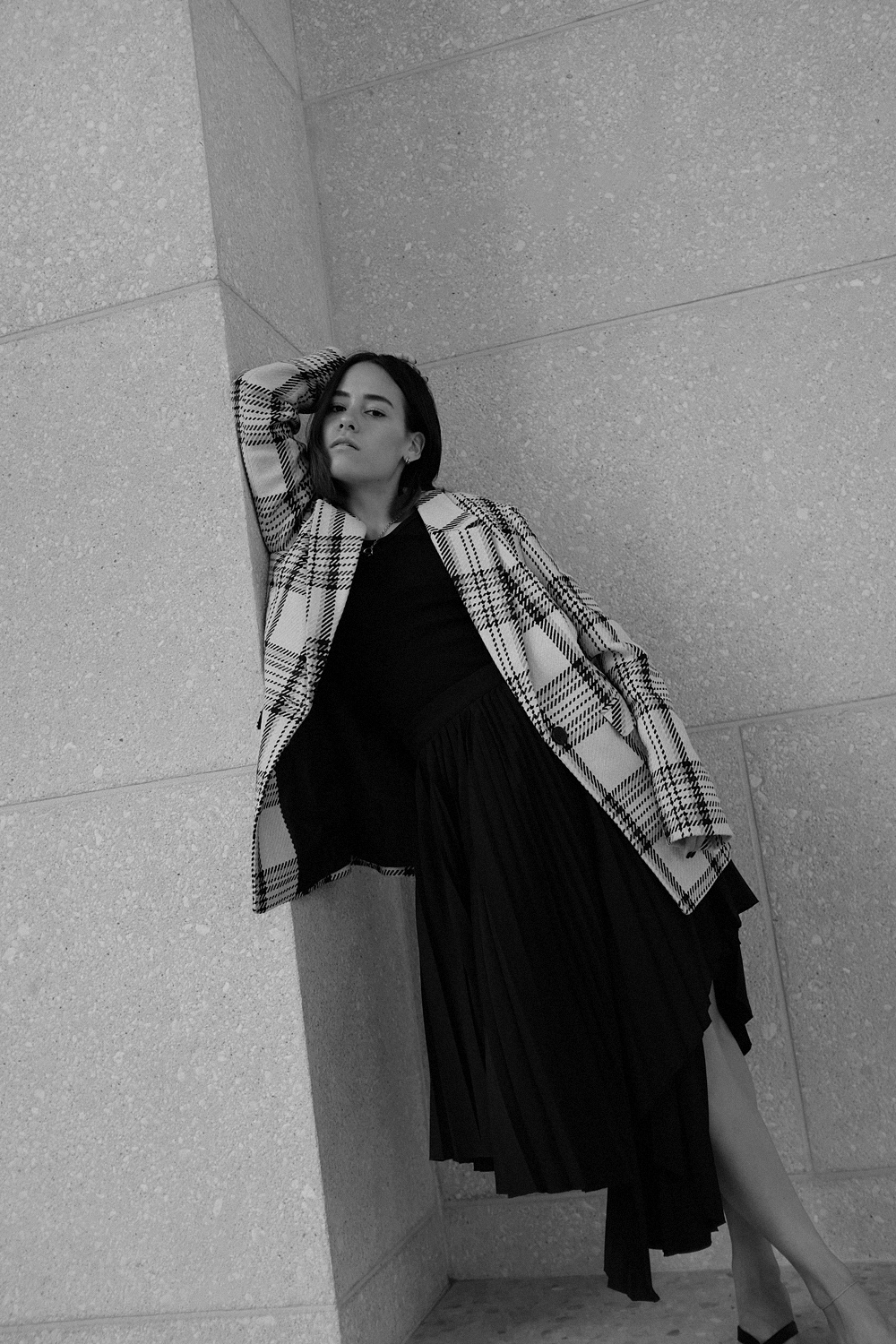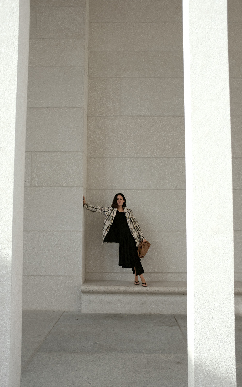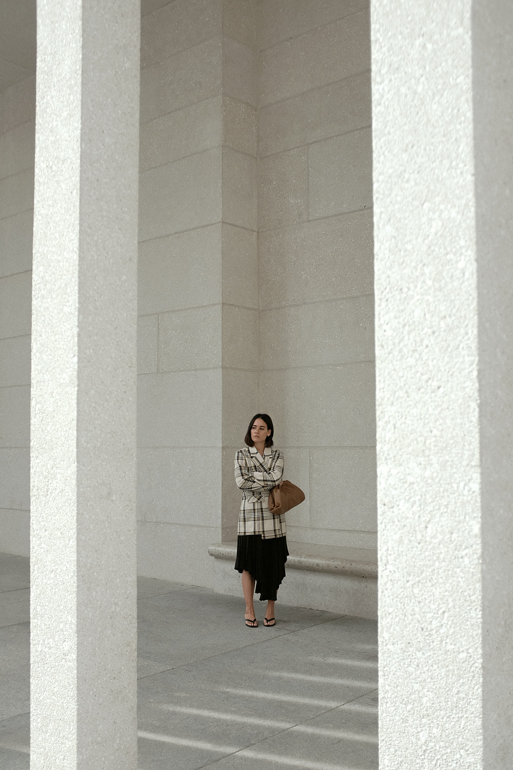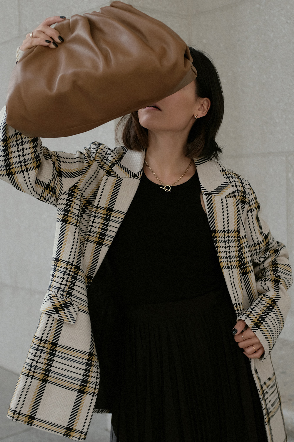 wearingChecked blazer – Edited the label. Pleated skirt – Maje (similar). Ribbed racer tank – Arket. „The Pouch“ bag – Bottega Veneta. Heeled Flip Flops – Totême (similar). „Coffee Beans“ necklace – All Blues (similar).