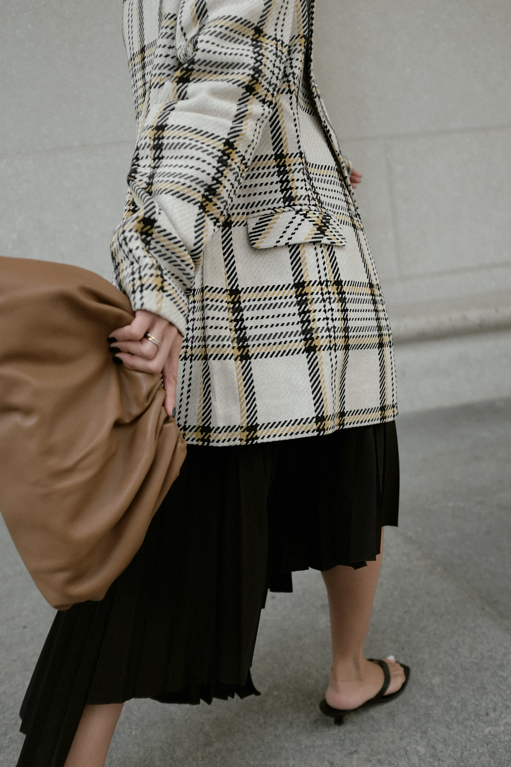 Checked blazer Edited the label. Pleated skirt Maje (similar). Ribbed racer tank Arket. „The Pouch“ bag Bottega Veneta. Heeled Flip Flops Totême (similar). „Coffee Beans“ necklace All Blues (similar).