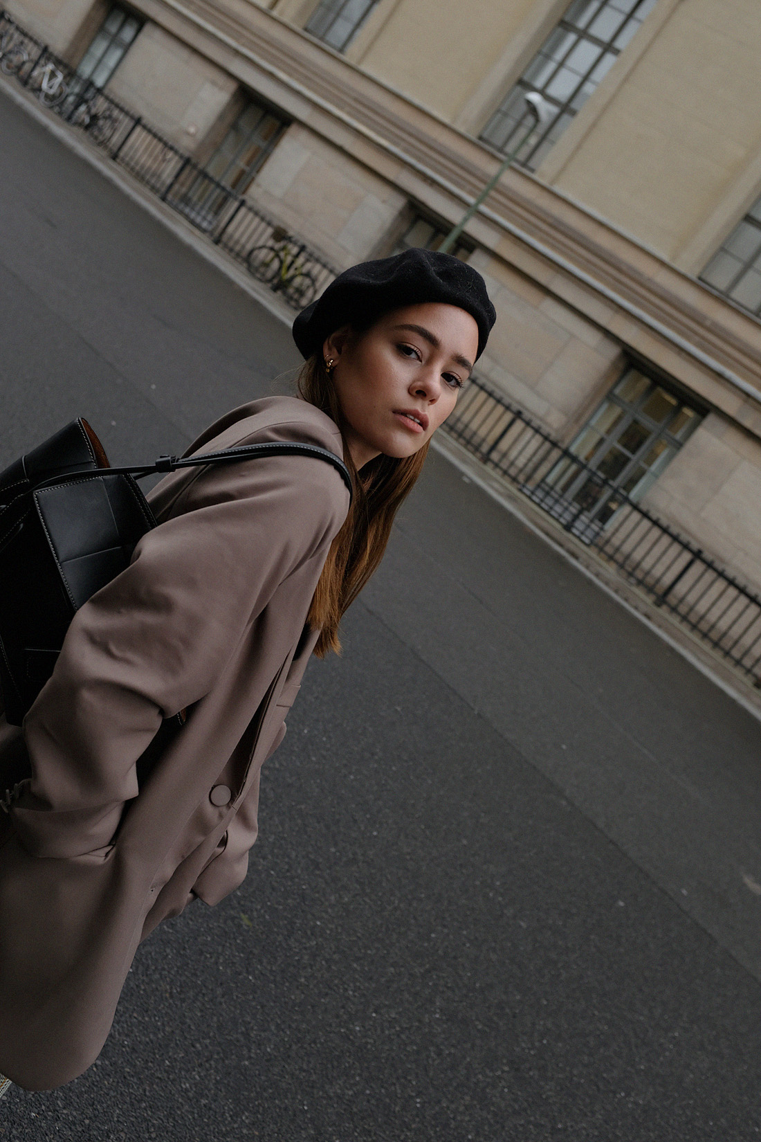 French style inspired. Diesen Look könnte man so oder so ähnlich auch auf diversen Repost-Instagram-Accounts finden, die so heißen wie ‚lestyledelafrancaise‘ oder ‚frenchgirldaily‘: Ein enger Rollkragenpullover zur figurbetonten Hose mit weitem Bein von Edited the Label, darüber ein Blazer mit oversized Schnitt – mein Exemplar ist aus Korea, aber es gibt eine schöne Alternative von & Other Stories, wie meiner ist der Blazer ebenfalls aus einem dickeren Stoff, so dass man (noch) keine weitere Jacke braucht. Um den Look etwas mehr edge zu verleihen, trage ich dazu die klobigen Lederstiefel von Arket kombiniert. Und auch wenn ich damit ein kleines Klischee bediene, der letzte Schliff macht auf jeden Fall die Baskenmütze D’accord!