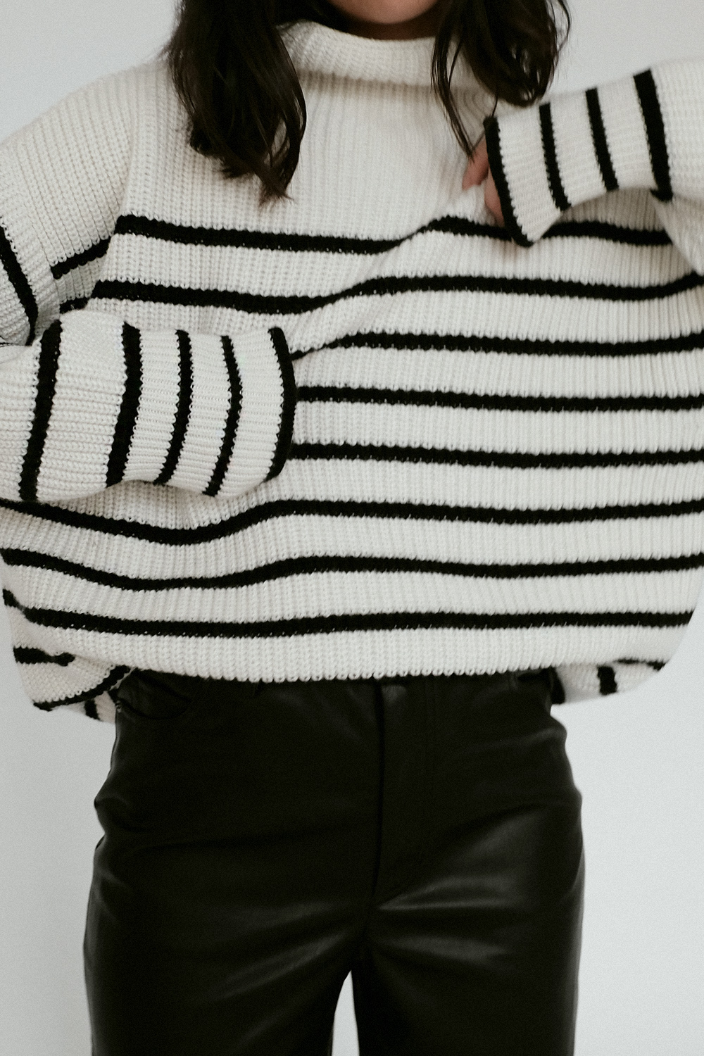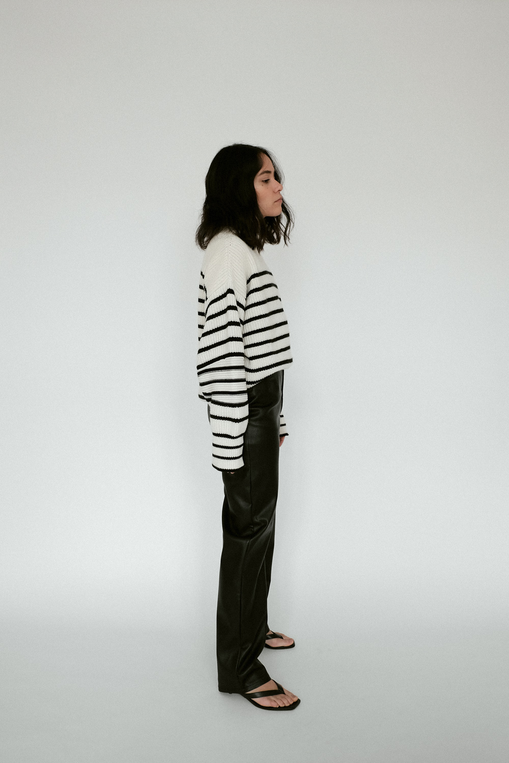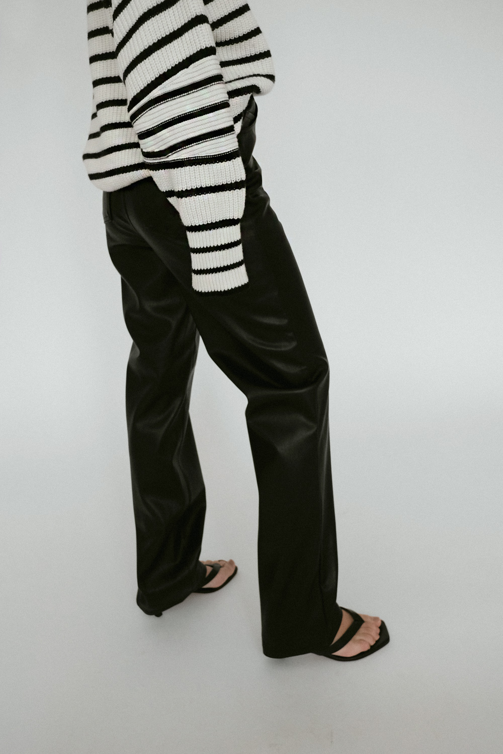 „Casey“ faux leather pants EDITED*. Striped knit sweater House of Dagmar (similar). Sandals Totême (similar). „Fat Snake“ rings All Blues. Gold ring Daphine (similar).