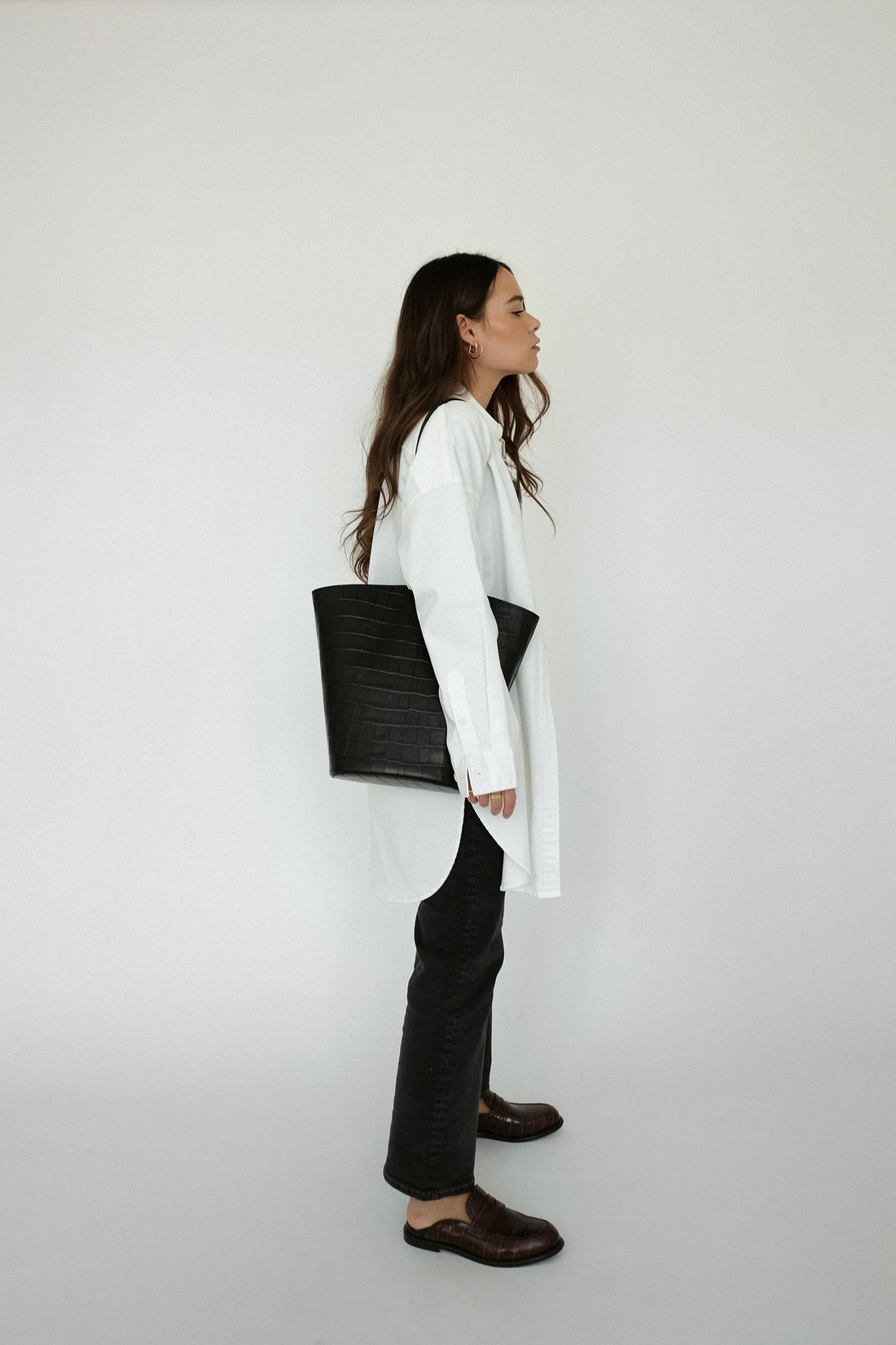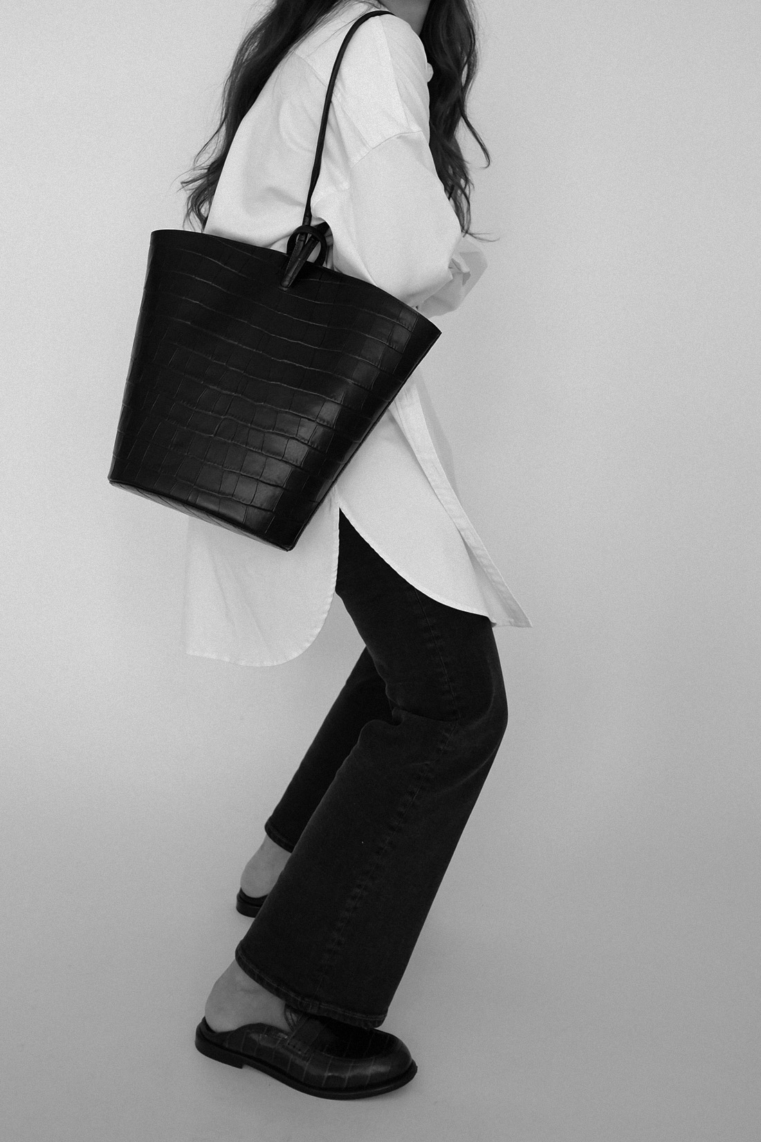 wearingRibbed body shirt – Edited. Cropped stretch jeans – Arket. White denim shirt (similar) – Babaton. Croc embossed loafers – Loewe. Loop bucket bag – Little Liffner.