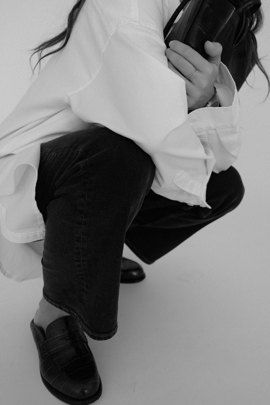 Sei es der Schnitt, das Material oder die Textur – die Details machen für mich den Look aus. In diesem Look habe ich einen schwarzen Bode mit eckigen Ausschnitt zu einem weissen, langen Denim shirt kombiniert. Dazu dunkelgraue gecroppte Denim und Accessoires in Krokodilleder-Optik.