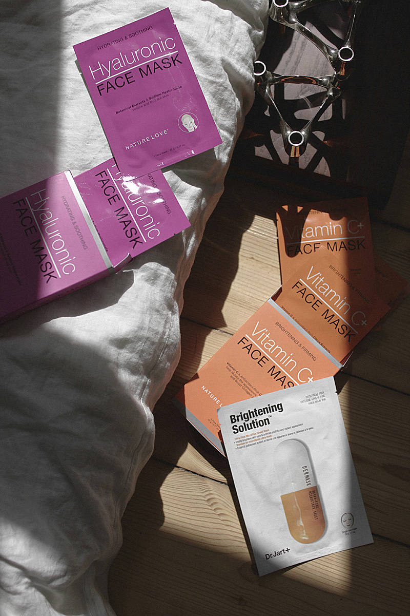 in this photoHyaluronic face mask – Nature Love. Vitamin C+ face mask – Nature Love. Brightening solution sheet mask – Dr.Jart.