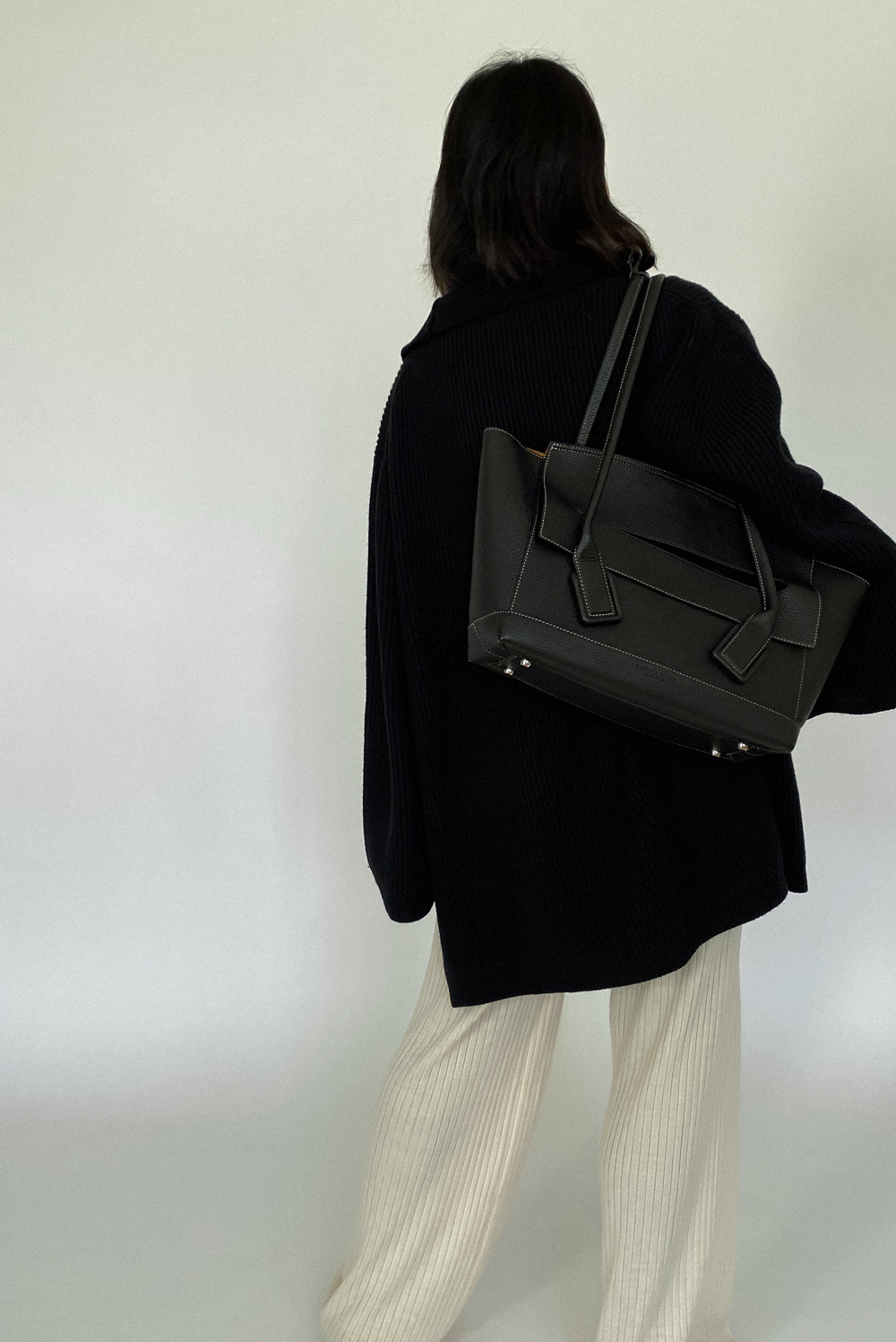 wearing„Tomar“ Fisherman Zip-Up Sweater – Totême (similar). Beige Knitted Rib Trousers – H&M (similar). Heeled Flip-Flop Sandals – Totême (similar). „Arco“ (medium) Black Leather Shopper – Bottega Veneta. „L’Or Liquide“ Mini Ear Hoops – by teetharejade.