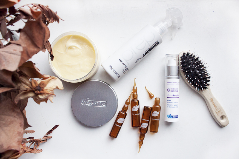 Ich wasche meine Haare nur alle 2-3 Tage, das spart extrem viel Zeit und ist auch besser für die Haare. Zur Zeit teste ich die silikon- und sulfatfreie Serie „Nature’s Rescue“ von Redken aus. Den Conditioner verwende ich allerdings nur jede zweite Haarwäsche. Zu der Serie gehört noch ein Haarpeeling, welches ich beim ersten Ausprobieren sehr seltsam fand aber im Endeffekt großartig finde! Perfekt für die Tage, wenn man das Gefühl hat, extrem viel Produkt im Haar zu haben. Ein Mal die Woche verwende ich eine Haarmaske, momentan am liebsten die reichhaltige Haarmaske Phytokarité. Zur Zeit kommt zwei Mal die Woche noch die revitalisierende Anti-Haarausfall Kur Phytocyane dazu. Dann noch ein Serum für die Spitzen – Phytokératine, wie die Haarmaske und der Kur ist das Produkt ebenfalls von Phyto. Und bevor ich mit den Glätteisen an die Haare gehe denke ich immer an einen Hitzeschutz!