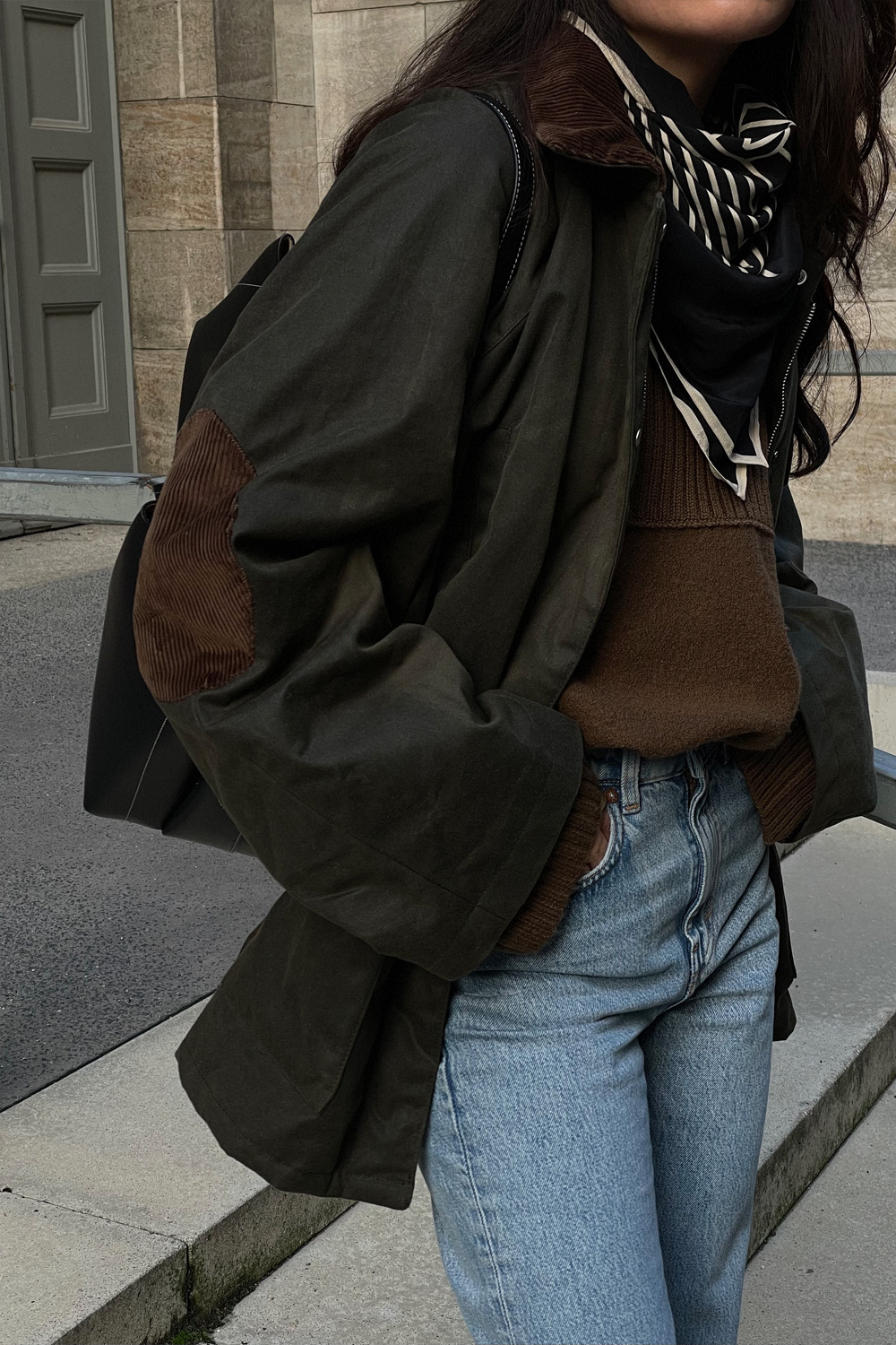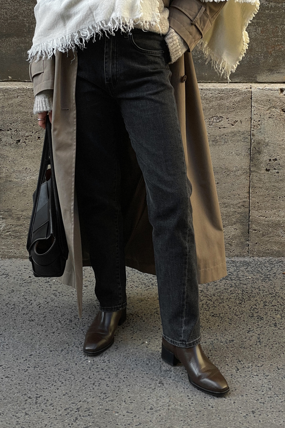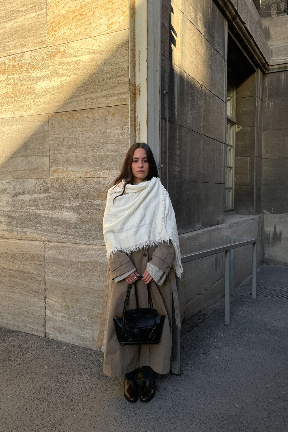 Kombiniert habe Ich sie mit einer Blue Jeans, einem braunen Strickpullover, zeitlosen Ankle Boots und meine liebste Office-Bag von Wandler, in der auch mein 15 Zoll großer MacBook Platz findet. Nisi hat ihren Look mit dem Jacquard-Schal von Totême geupgradet und in Weiß ist er auch der absolute Hingucker. Sie trägt außerdem noch einen langen Trenchcoat (Tipp: Eine Heattech-Jacke macht jeden Herbstmantel wintertauglich), Denim in ausgewaschenem Schwarz und Chelsea-Boots.