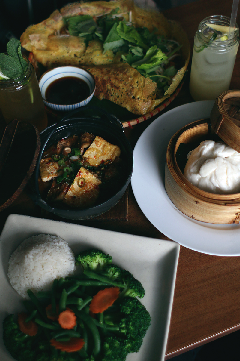 fresh herbs & a homemade dip – Stuffed tofu dumplings in a crock with spice blend. Served with steamed vegetables – Vietnamese steamed bun – Iced teas