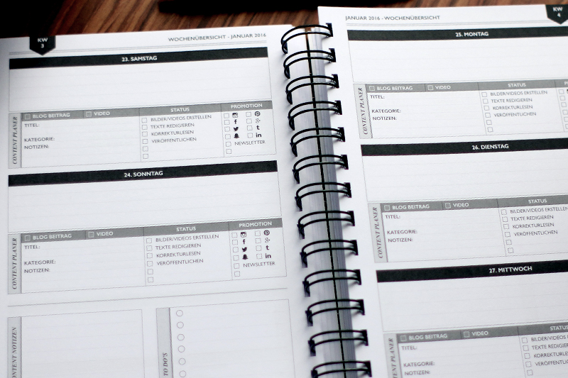 - Pro Tag gibt es Platz für Notizen und einen kleinen Content Planer (siehe Fotos)