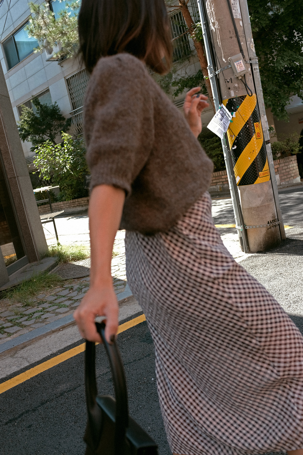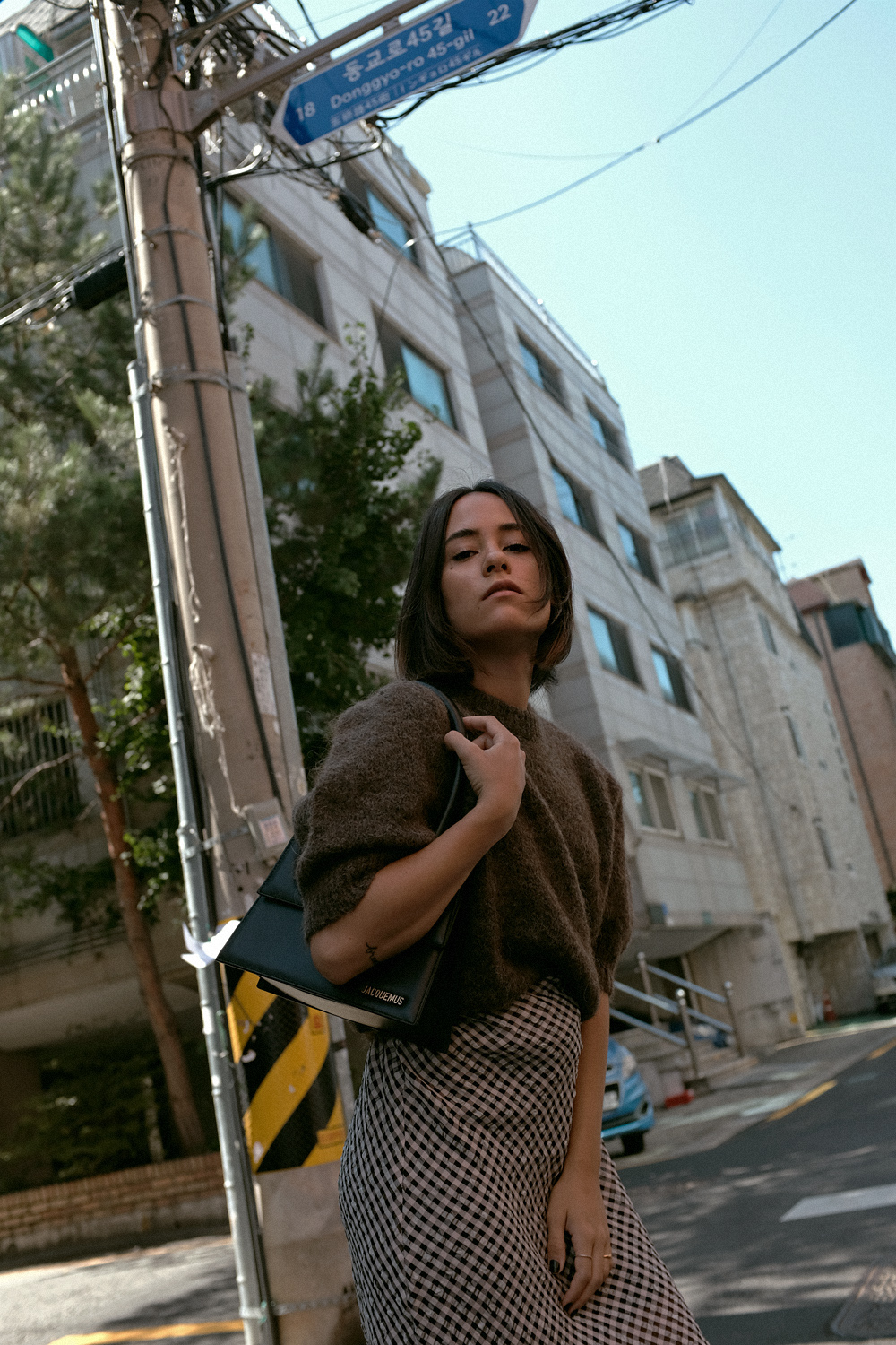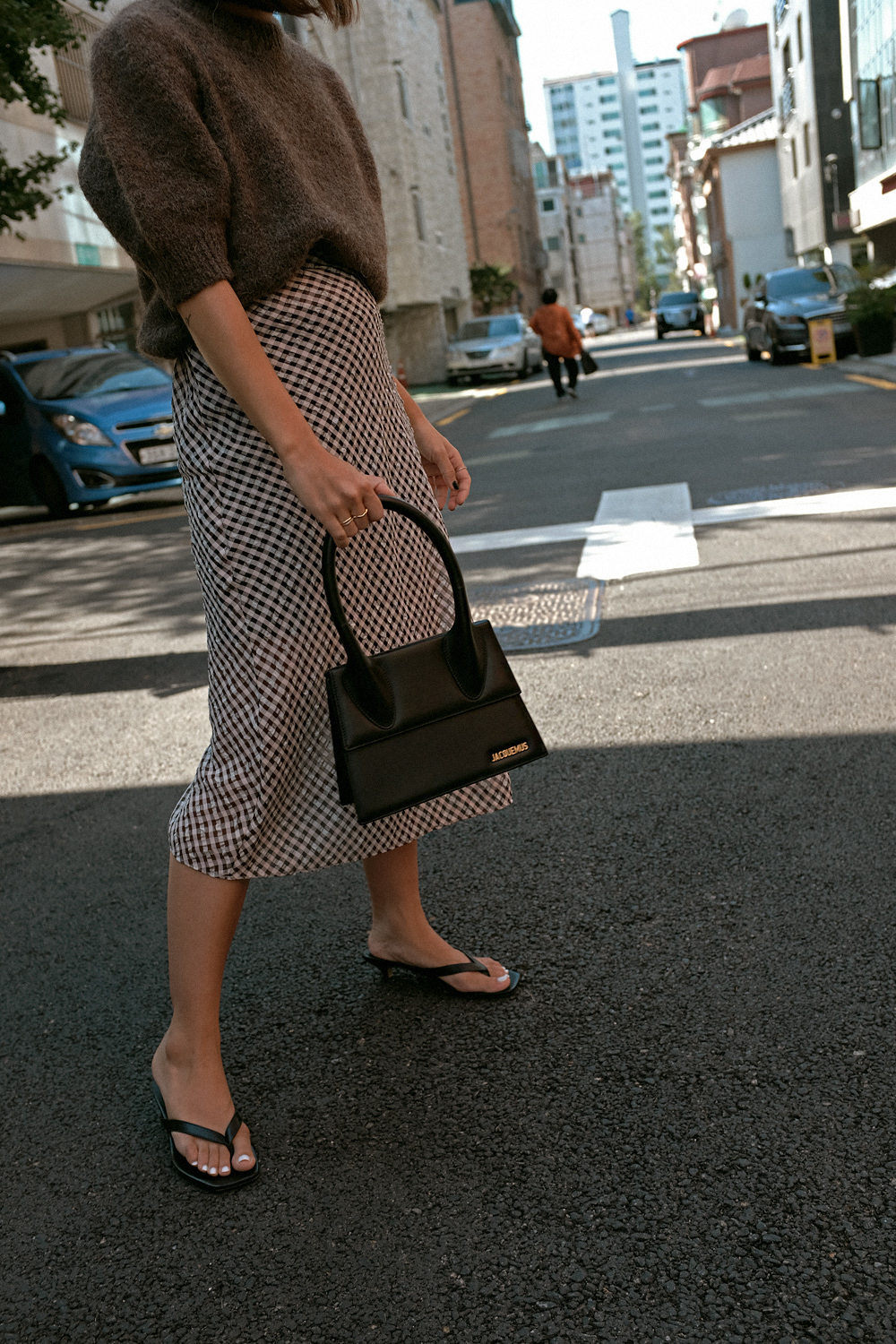 wearingAlpaca wool sweater – Edited the label. Gingham skirt – & Other Stories. Heeled Flip Flops – Totême (similar). „Le Grand Chiquito“ bag – Jacquemus.