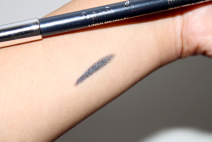 (1) Einen metallisch glitzernden Kajal von Agnès B. Er ist recht gräulich mit leichten Blaustich – irgendwie eine interessante Farbe und der hält echt gut. Ich kann mit den Finger ganz fest drüber reiben und er geht trotzdem nicht ab. Gut für ganz simple Lidstriche für den Alltag oder großzügig aufs ganze Lid aufgetragen und mit einem Pinsel verblendet ergibt er einen doch sehr schönen Eyelook zum Ausgehen und sieht dabei nicht ganz so hart und „extrem“ aus.