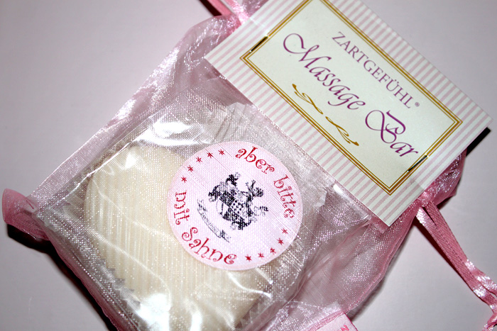 (5) Ein Massagebar von Zartgefühl zum Einreiben nach dem Duschen. Die Verpackung ist aufjedenfall gelungen, zum Geruch kann ich noch nichts sagen, da Desi überlegt, das zu verschenken (bietet sich an, ist ein niedliches Teil). Ich würd den Massagebar aber am liebsten behalten und selbst austesten ^^
