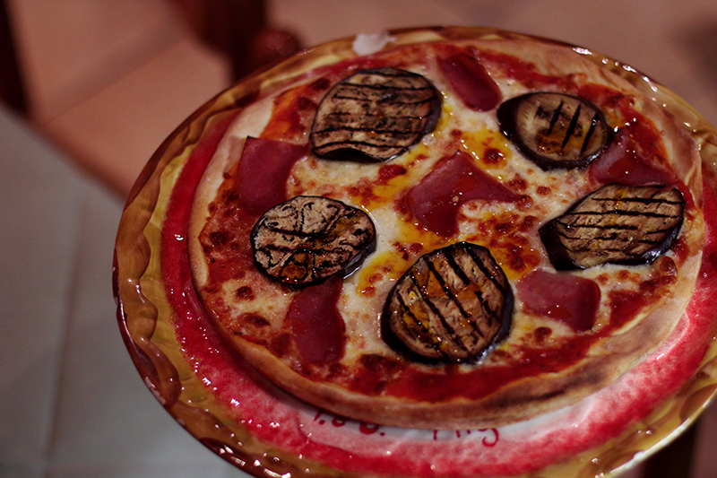 Pizza Toscanini – Pizza mit Prosciutto, Auberginen und Peperoncino-Öl