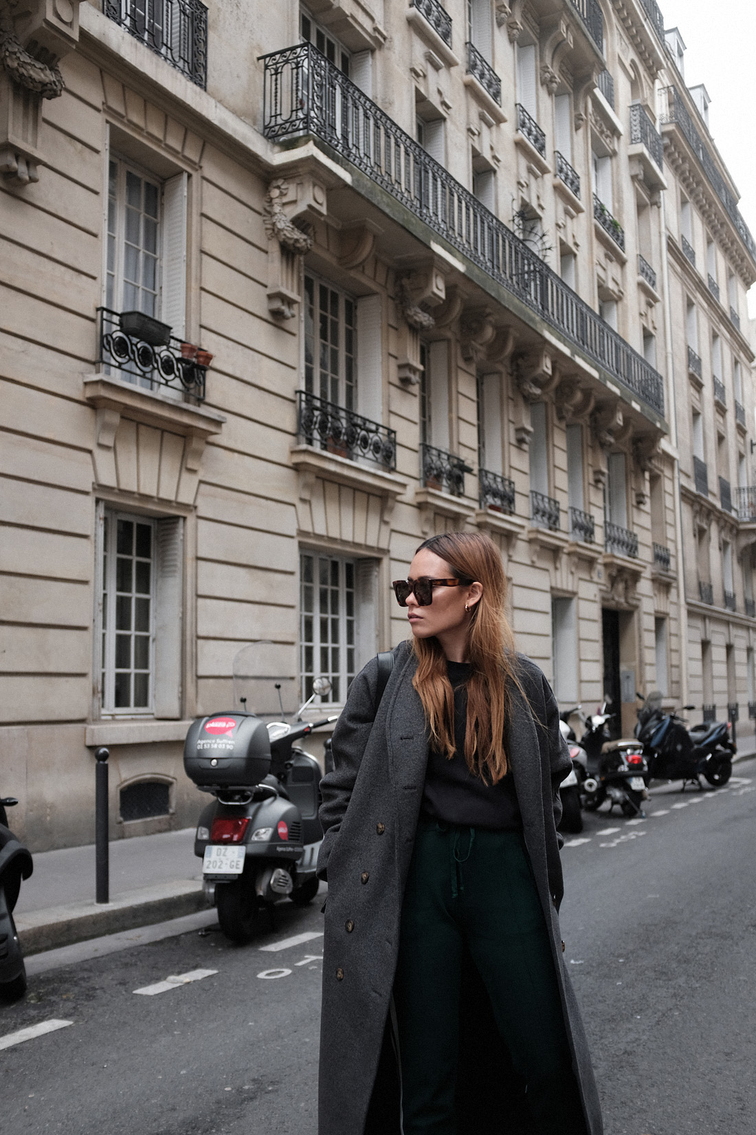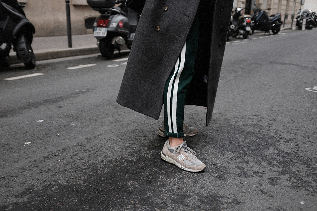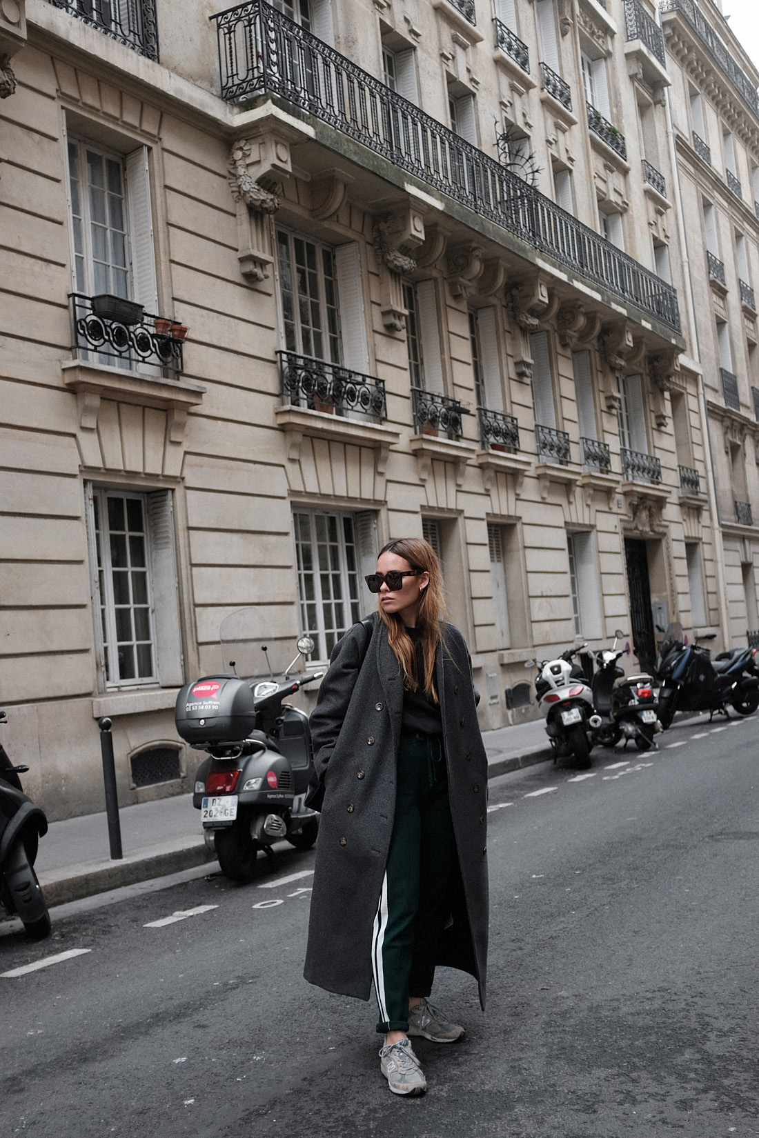 wearingGrey wool coat – Totême. Anthrazit basic jumper – Fruit of the Loom. Jogger pants – Isabel Marant Étoile. 991 sneakers – New Balance. ‚Tilda‘ sunglasses (similar) – Céline. ‚L’Or Liquide‘ earrings – by teetharejade.