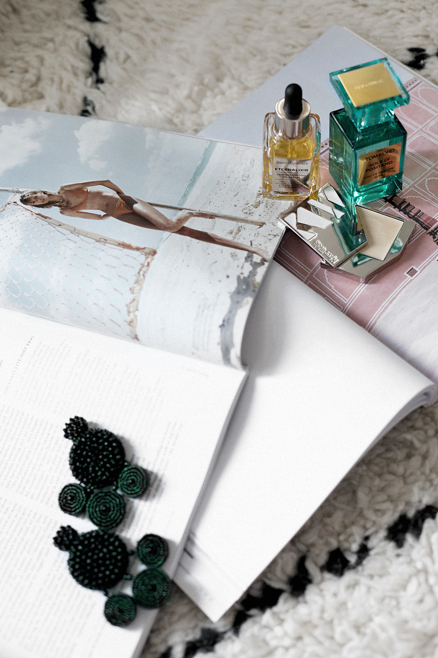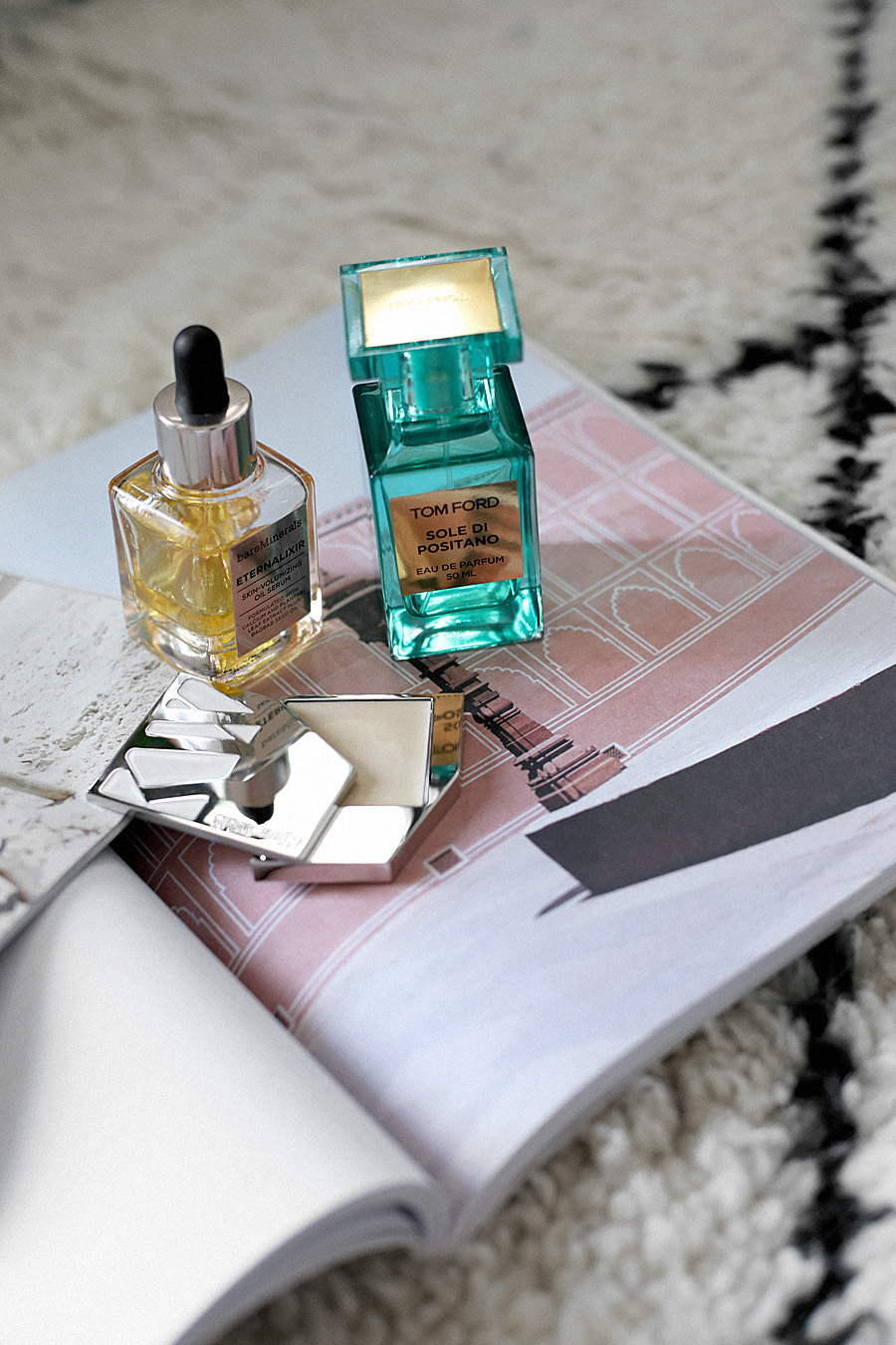 in this photoSole Di Positano EdP – Tom Ford. Skin-volumizing Oil-Serum – bareMinerals. Cream Highlighter „Ravishing“ – Kjær Weis.