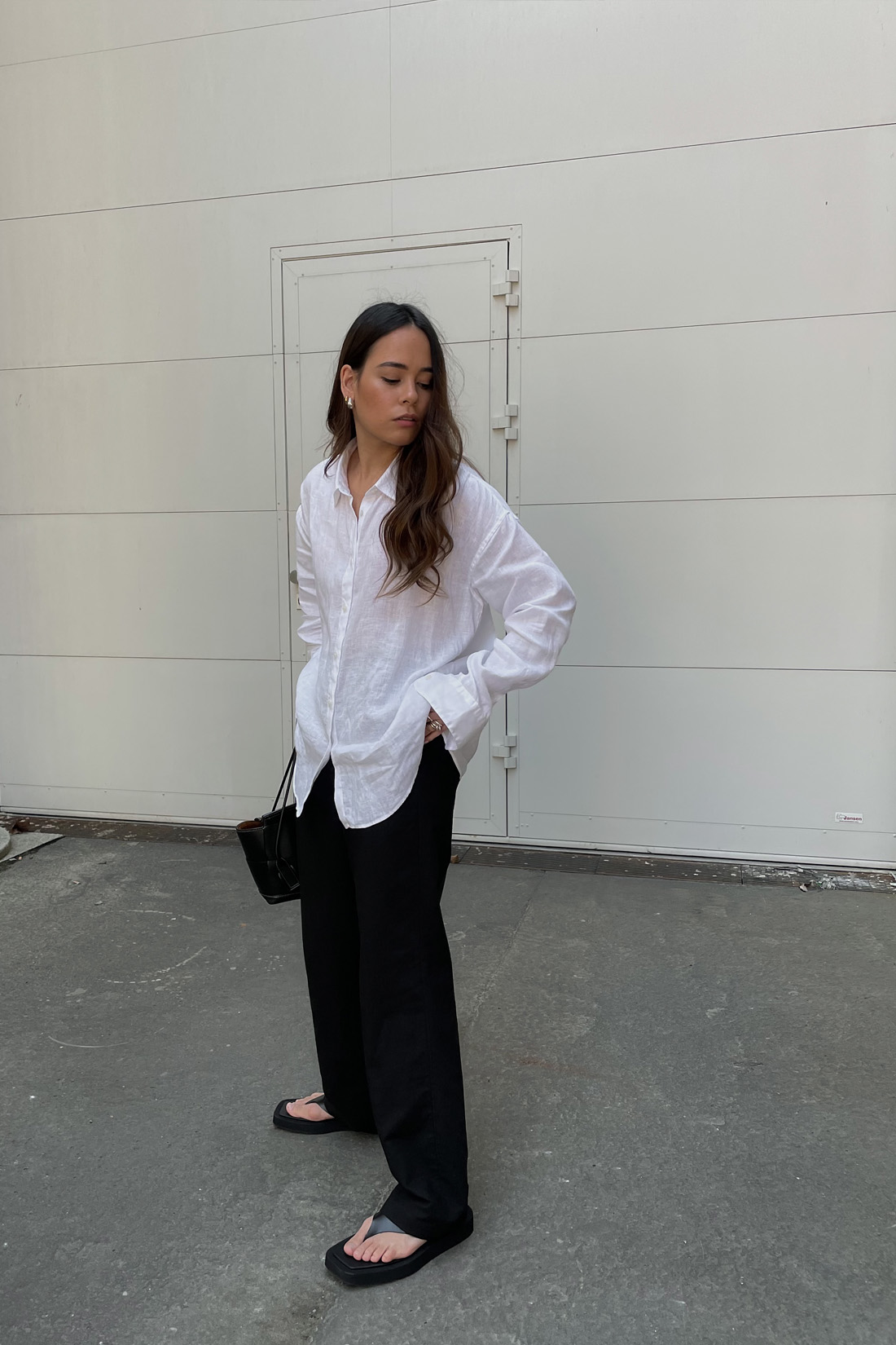 wearingLinen shirt Uniqlo. Linen trousers Uniqlo. Thong strap sandals (similar) Edited. ,Arco‘ shoulder bag Bottega Veneta. Silver hinged hoop earrings Sophie Buhai.