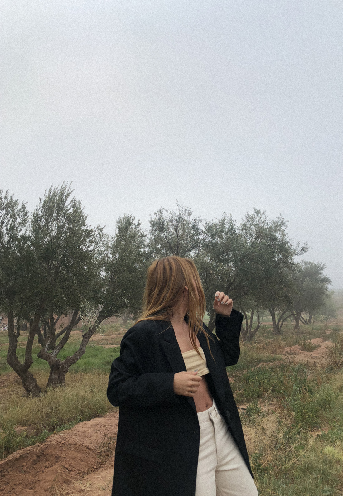 wearingOversize blazer – H&M. Nude swim top – Apollo Swim. Creme-colored jeans – & Other Stories.