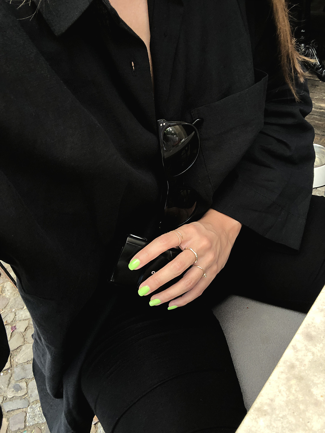 Angefixt wurde ich von Karoline (Frollein Herr). Als ich auf ihren Nägeln das leuchtende Neongrün sah, habe ich direkt drei Neon-Farben bestellt. Und das Nein-Gelb mag ich mindestens genau so gern. Nur das Neon-Orange, was es noch in meinem Warenkorb geschafft hatte, gefällt mir nicht so sehr. Es lässt meinen Teint irgendwie merkwürdig aussehen. Nichtsdestotrotz, von Grün und Gelb bin ich großer Fan und gerade bei einem recht minimalen Outfit oder gar monochromen Looks in Schwarz, Weiß, Grau oder Beige ist es ein schöner und auffälliger Farbakzent, ohne dass man kleidungstechnisch zu Farbe greifen muss.