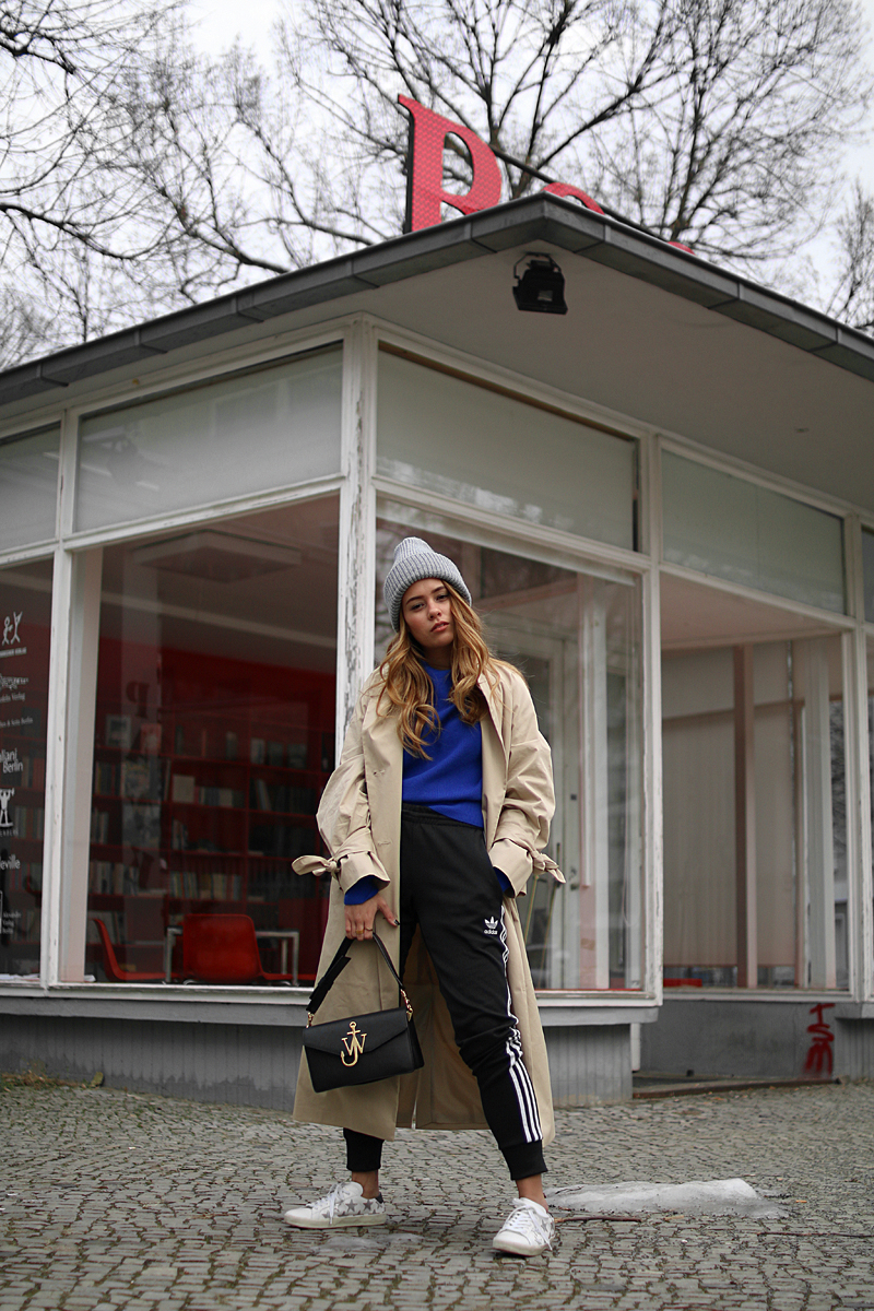 wearingTrenchcoat – EDITED the Label. Cashmere Jumper – H&M. Jogging Pants – Adidas Originals (similar). Sneaker – Saint Laurent. Bag – J.W.Anderson (similar). Knitted Hat – Zara (similar). Watch – Abbott Lyon (similar).