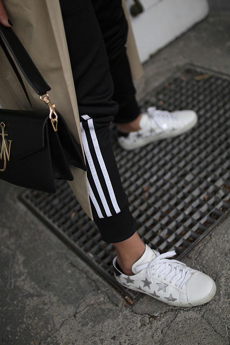 Athleisure. Wenn man seine Sportsachen im Alltag trägt, kann das großartig aussehen, wenn man die richtigen Sachen dazu kombiniert. Für meine Jogginghose von Adidas Originals wählte ich wohl eines der gegensätzlichsten Kleidungsstücke aus: der Trenchcoat.