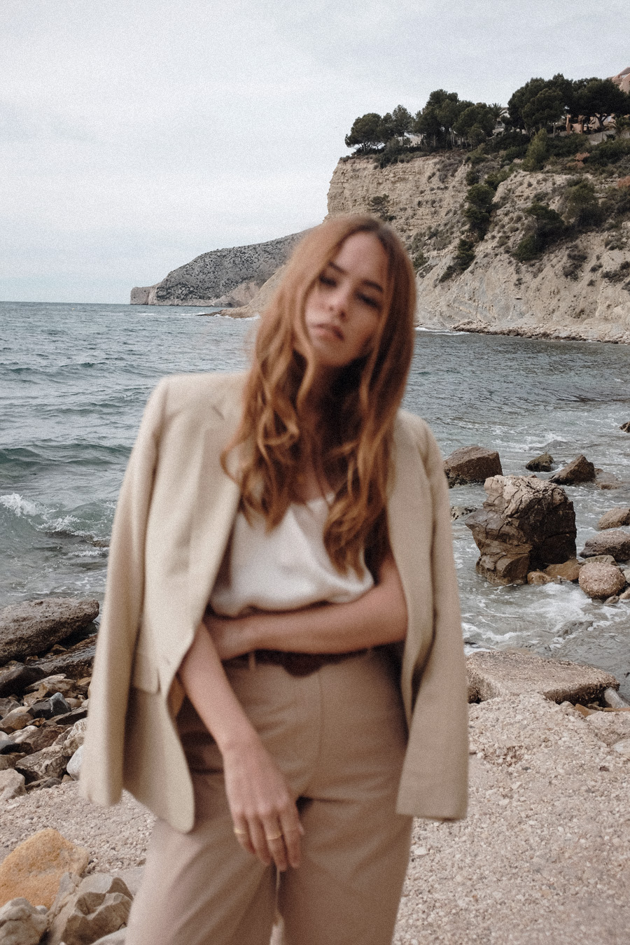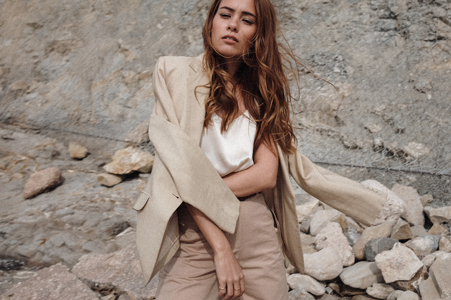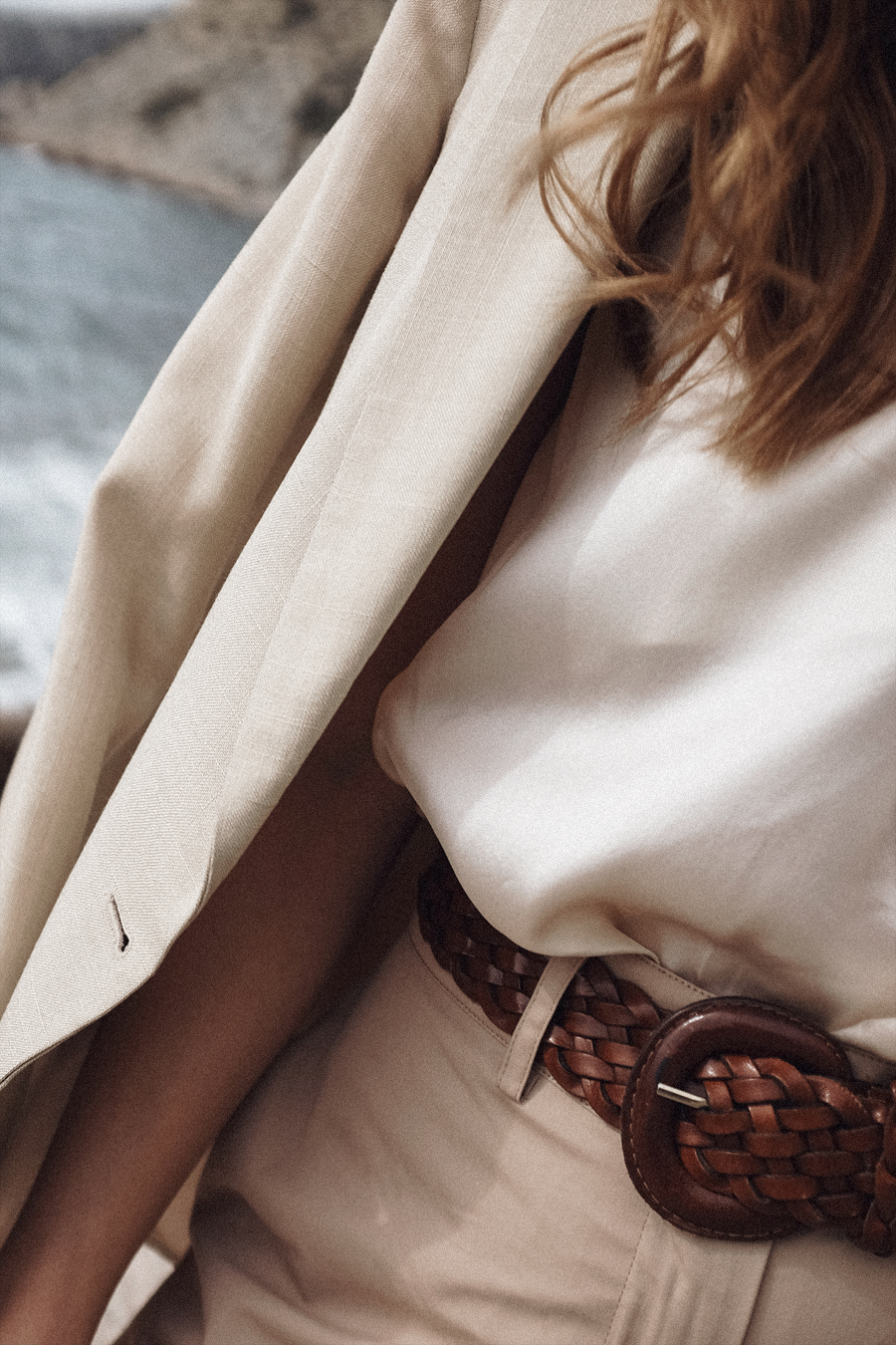 Ein monochromer Look komplett in beige: Ein Vintage Blazer, eine weite Hose und ein Satin-Top, aufgebrochen mit einem braunen Flecht-Gürtel. Erinnert ein wenig an einen Vintage-Safari-Look? Stimmt! Ich stelle ihn mir aber toll zur einem Meeting, einem Abendessen oder einem anderen etwas förmlicheren Anlass vor. Und ganz besonders mag ich den androgynen Look dabei!