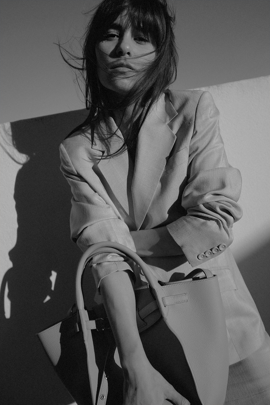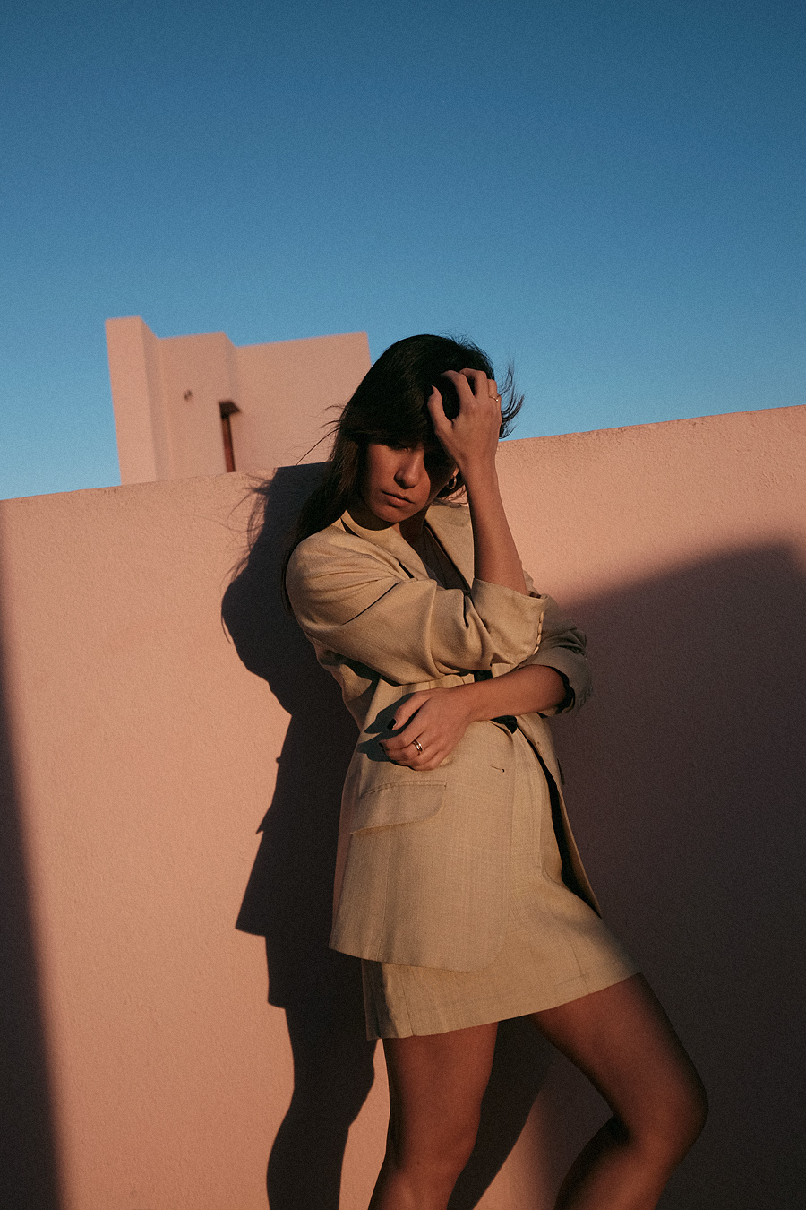 Beige blazer – Vintage (similar). Beige skirt – Vintage (similar). Camisole – Theory (similar). „Big“ bag – Céline (similar). „Vintage Club C 85“ sneaker – Reebok.