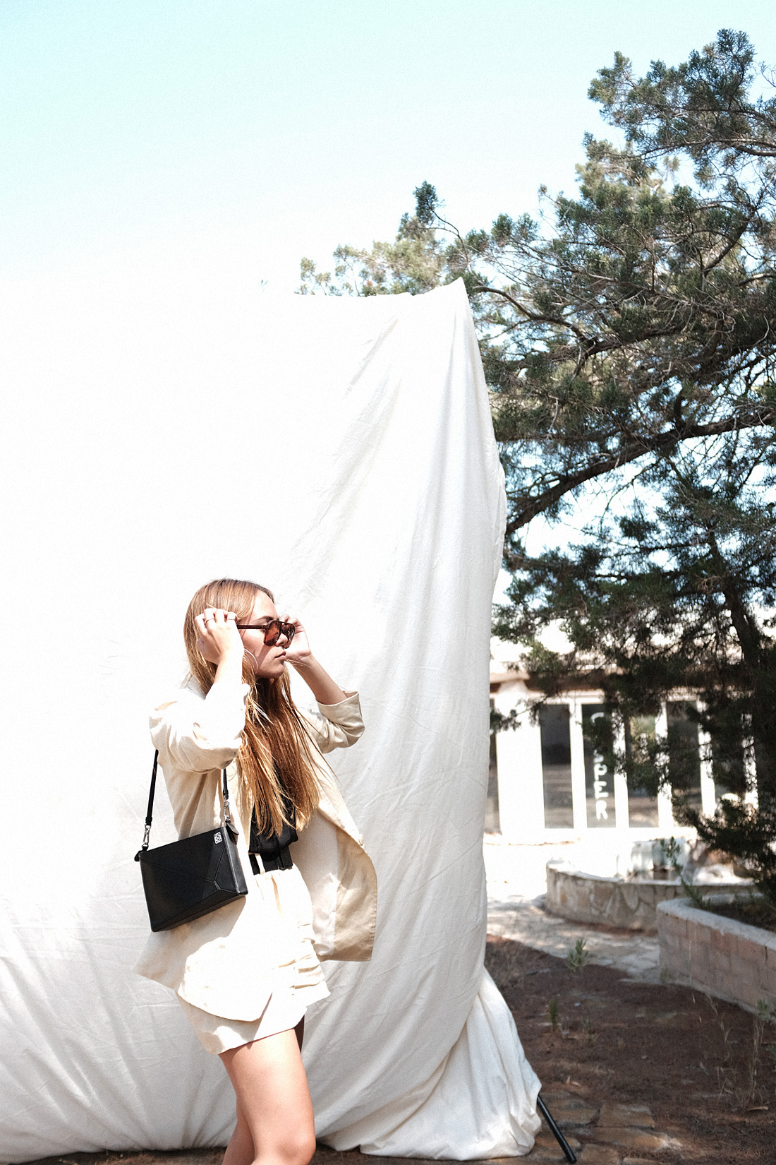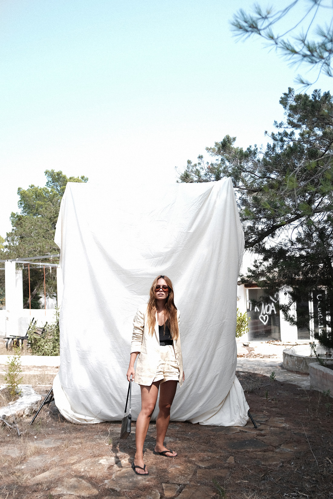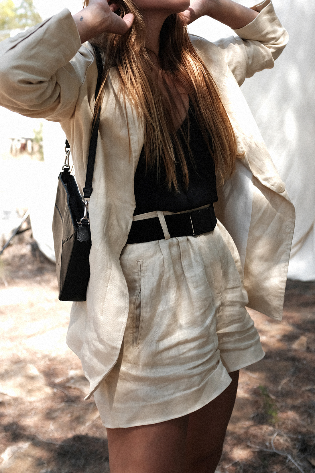 Linen blazer – Mango. Tanktop – H&M. Linen shorts – Mango. Flip flops – Havaianas. Puzzle clutch bag – Loewe. Sunglasses – Céline Buckle belt – N°21.