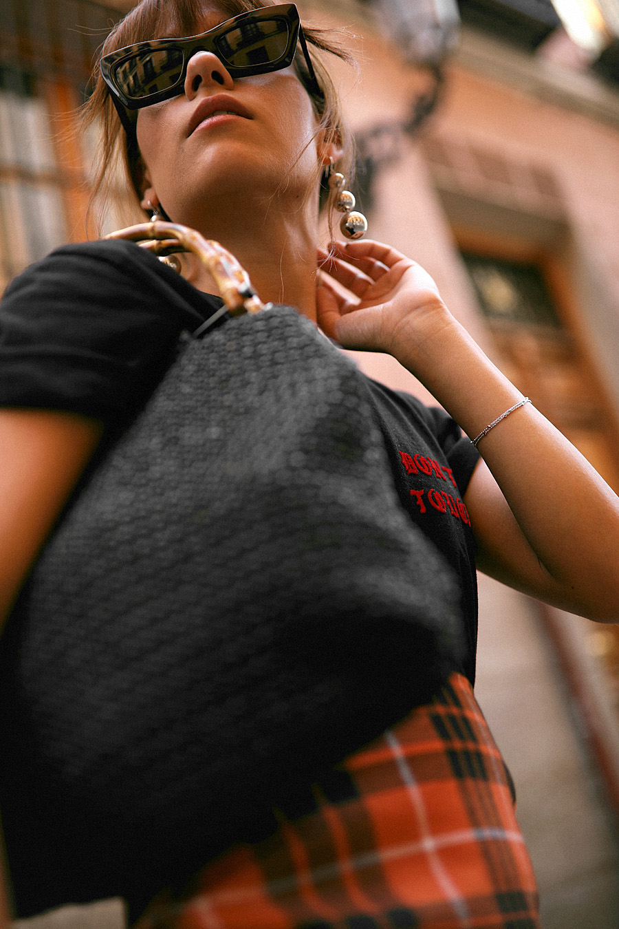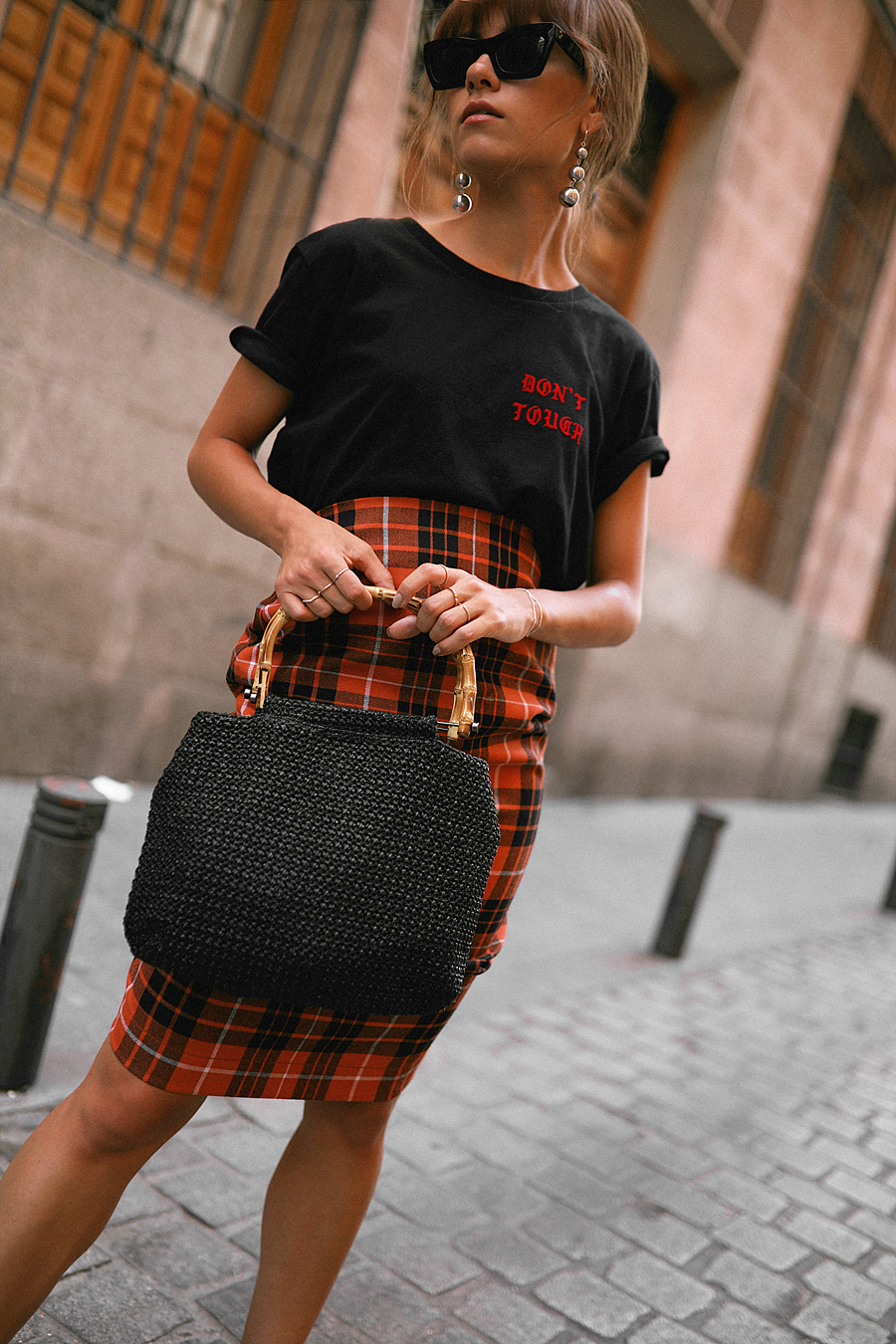 wearing„No means no“ T-Shirt – Wrstbhvr (similar). Plaid skirt – Vivienne Westwood (similar here or here). Black straw bag – Mango. „Oran“ Sandals – Hermès (similar here or here). Earrings – Mango. „Eva“ Sunglasses“ – Céline (similar).