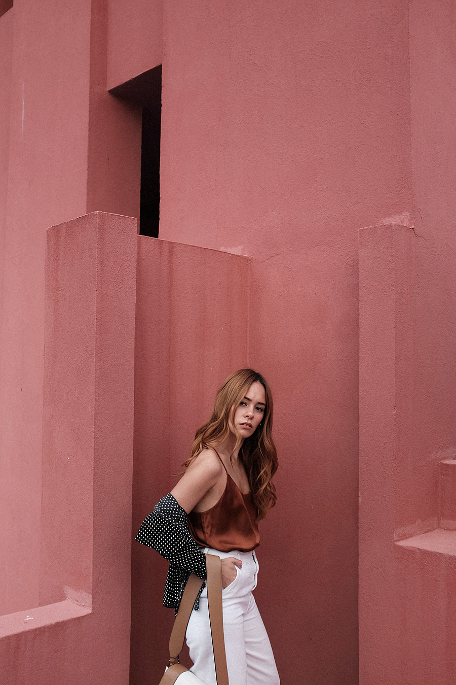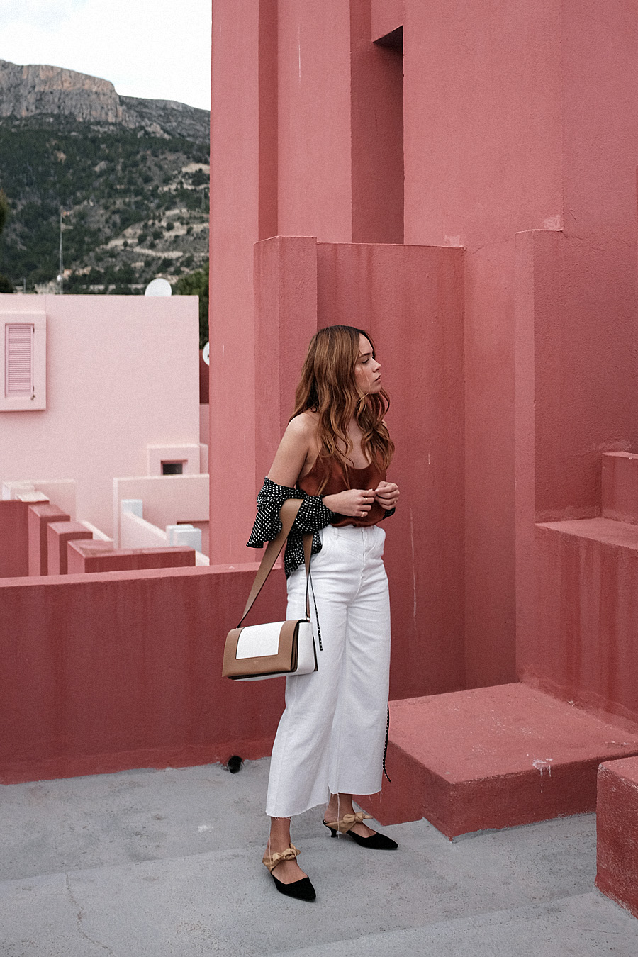 Endlich ist dieser Look aus Calpe auch bei uns tragbar! Die weiße Jeans ist derzeit meine Lieblingsjeans, da sie extrem high-waisted geschnitten ist und die weiten Hosenbeine super entspannt aussehen – gerade bei der Farbe. Dazu trug ich ein kupferfarbenes Satintop, ein gepunktetes Wickeltop offen als Jacke und meine Mules mit Schleife. Ich kombinierte also Punkte und Schleifen, welche ich normalerweise niemals zusammen tragen würde, in dieser Farbpalette fand ich es aber ganz schön, da es trotzdem nicht zu süss aussah.