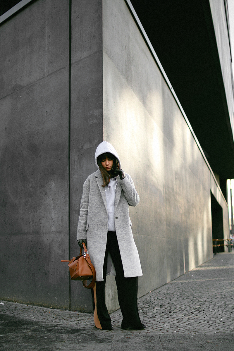 wearingGrey hoodie – BDG (similar). Coat – All Saints (budget option). Side-stripe pants – Edited the Label. Puzzle Bag – Loewe. Leather Gloves – COS (similar). Boots – Aeyde (similar)