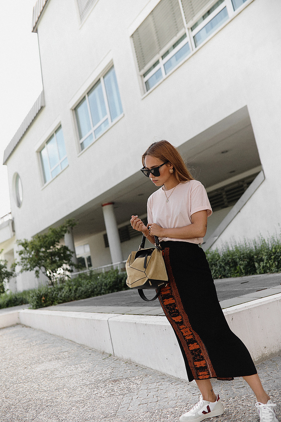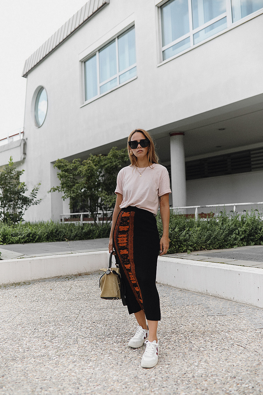 Dem kühleren Wetter sei Dank habe ich ausnahmsweise mal nicht die Hermès Sandalen an, sondern gebe endlich mal ein paar anderen Tretern eine Chance. Ich kombinierte zum Midirock, den ich in Stockholm gekauft hatte, ein paar Sneaker. Lange Röcke mit Sneakers kombiniert erinnern mich immer sehr an den typisch skandinavischen Look, den wir auch kürzlich wieder in ein paar Streetstyles von der Kopenhagen Fashion Week bewundern konnten. Dass ich dazu auch noch zwei skandinavische Labels trage – der Rock ist von House of Dagmar und das T-Shirt von Weekday – ist umso passender.