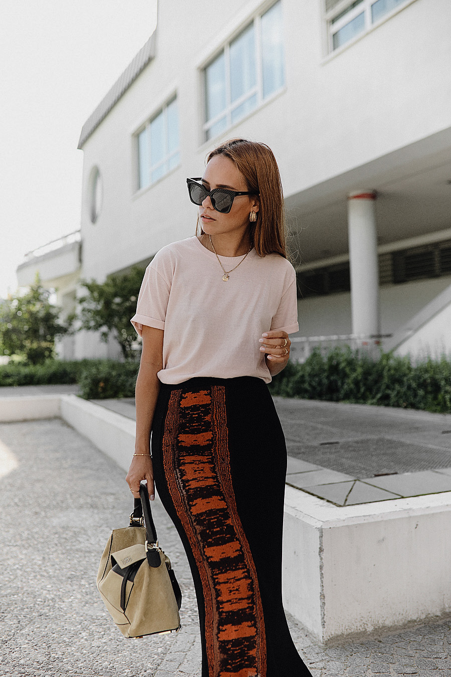 T-Shirt – Weekday (similar). Skirt – House of Dagmar. Sneakers – Veja (similar). „Puzzle“ bag – Loewe (similar). Sunglasses – MCM. Earrings – Brie Leon.
